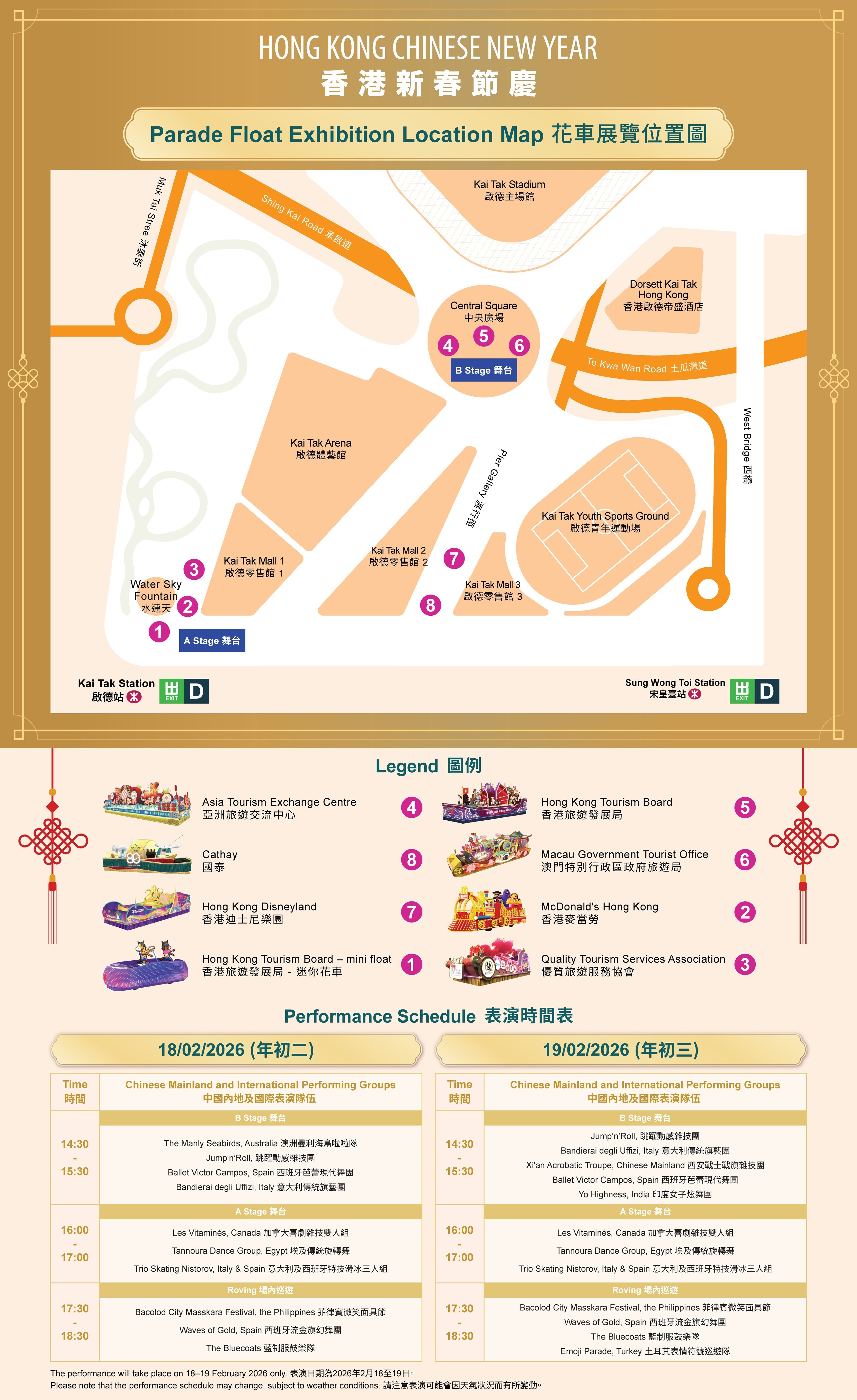 萬一錯過花車精彩表演,亦毋須擔心!今屆8輛特色花車將首度於啟德體育園展出(2月18至26日),年初二及年初三(2月18及19日)更會增設兩個舞台,邀請多支參與匯演的中國內地及國際表演隊伍即場獻技。而由年初二(2月18日)至正月十六(3月4日),其餘4輛花車則會於海洋公園、大埔林村、沙田馬場、銅鑼灣維多利亞公園展出,表演團隊亦會親臨多區商場及景點獻技,延續匯演精彩。