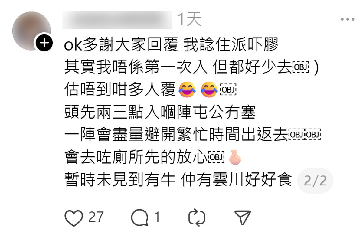 發文學生其後感謝一眾網民回覆,直言原本只是打算「派吓膠」,意想不到會有這麼多人回應,又稱自己的確很少往屯門,當日下午前往屯門時屯門公路沒有塞車,離開時會盡量避開繁忙時間和先如廁。此外,亦有人「回帶」張貼一則關於屯門騎術學校走馬的舊新聞,提醒發文學生「小心有馬」,也有網民問「有無騎牛」、「要網上預約定牛,唔係嘅話出入好唔方便。」