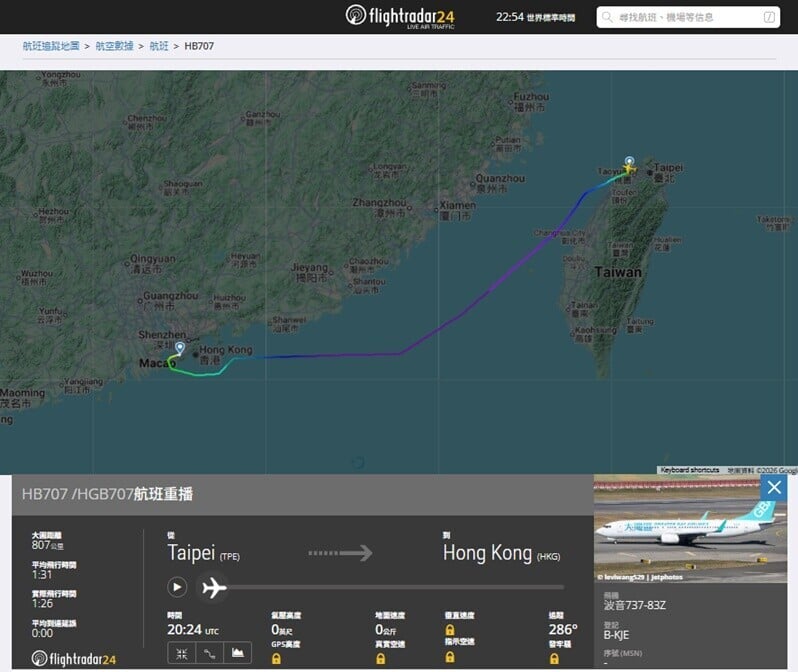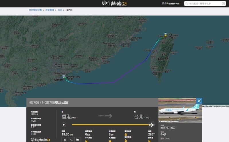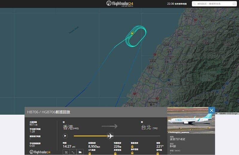 依據航班追蹤網站flightradar24資料顯示,HB706在台灣新竹外海下降高度,盤旋7個圈仍未能降落,於凌晨約0時45分安全返抵香港,至今日(16日)凌晨2時15分再次起飛,於凌晨約3時半順利飛抵台北,整個航程時間最終超過7個小時。