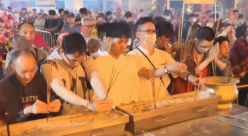 踏入子時,黃大仙祠大批市民上頭炷香。(有線新聞截圖)