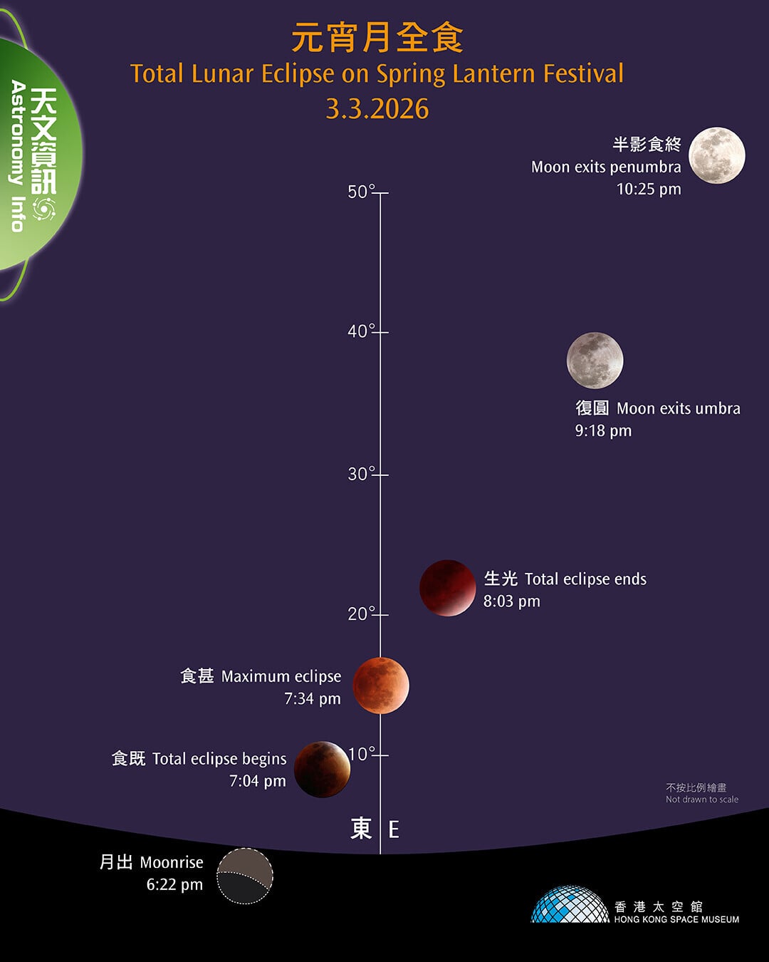 香港太空館將於3月3日晚上7時15分起,在網上直播元宵月全食。