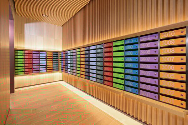 走進樂嶺都匯,便可發現長者友善設計無處不在,如大廈信箱用上不同顏色,對比鮮明,號碼清晰易辨,更暗藏巧思,舉例淺藍色是特定樓層的專用色,不論開信箱或回到所住樓層,長者只需辨認淺藍色,便可避免走錯。