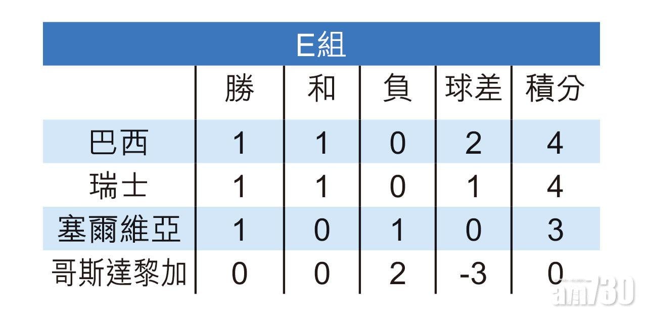 巴西今晚將於最後一輪分組賽事,在斯巴達球場鬥塞爾維亞,「森巴兵團」只要贏波就肯定晉級,他們從未敗予塞爾維亞,只曾在1930及1934年不敵其前身南斯拉夫。塞爾維亞贏波的話亦肯定出線,如瑞士在同組另一仗以多過一球敗予已出局的哥斯達黎加,塞爾維亞即使和波亦可晉級。