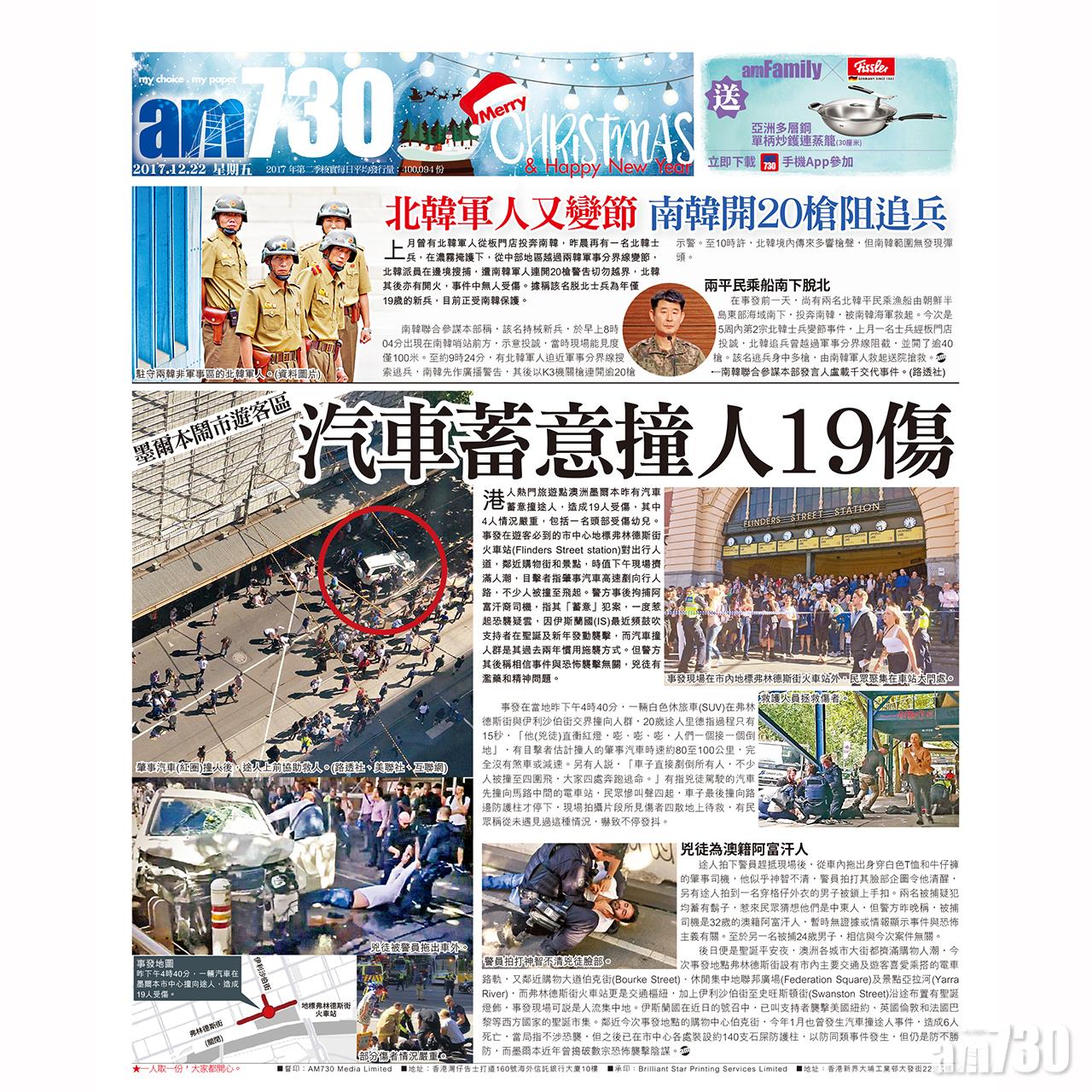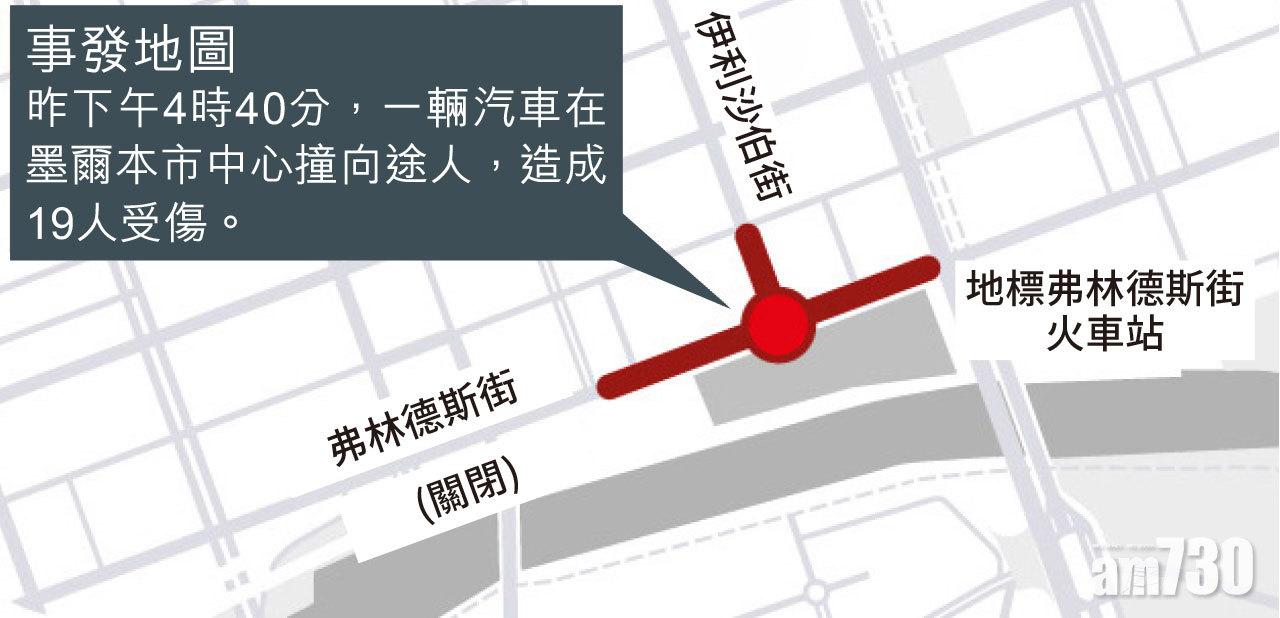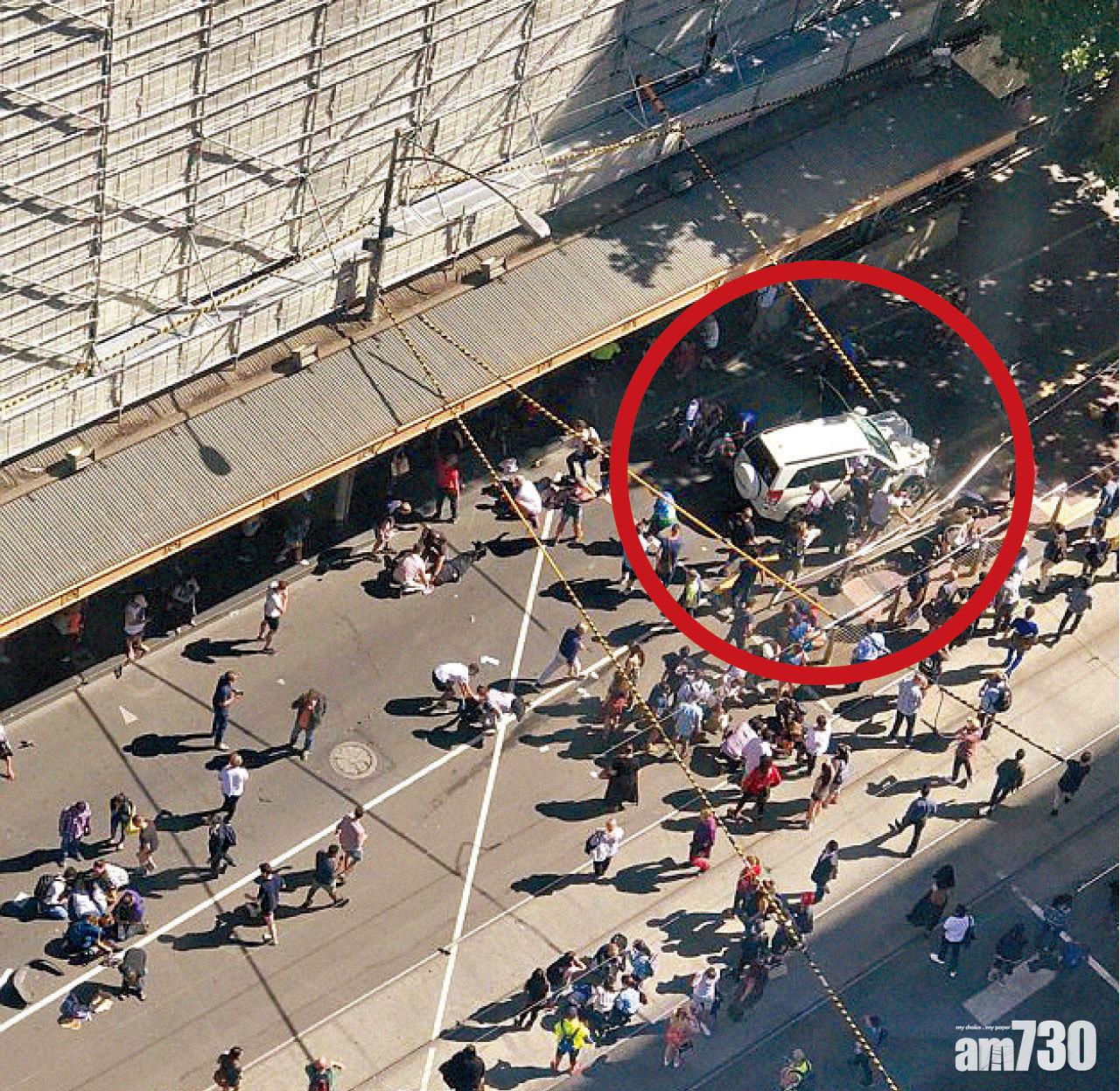 港人熱門旅遊點澳洲墨爾本昨有汽車蓄意撞途人,造成19人受傷,其中4人情況嚴重,包括一名頭部受傷幼兒。事發在遊客必到的市中心地標弗林德斯街火車站(Flinders Street station)對出行人道,鄰近購物街和景點,時值下午現場擠滿人潮,目擊者指肇事汽車高速剷向行人路,不少人被撞至飛起。警方事後拘捕阿富汗裔司機,指其「蓄意」犯案,一度惹起恐襲疑雲,因伊斯蘭國(IS)最近頻鼓吹支持者在聖誕及新年發動襲擊,而汽車撞人群是其過去兩年慣用施襲方式。但警方其後稱相信事件與恐怖襲擊無關,兇徒有濫藥和精神問題。