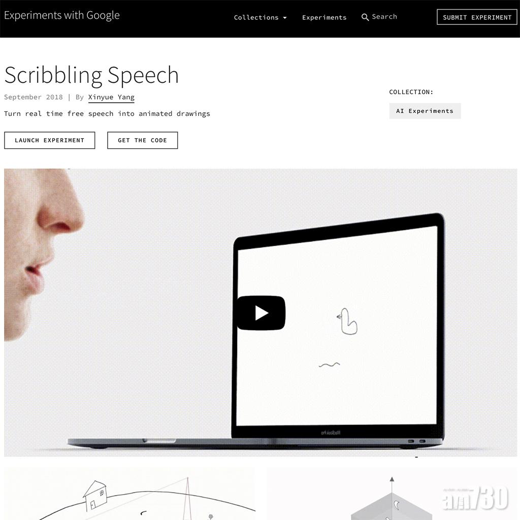 小遊戲3:Scribbling Speech 透過Google語音識別系統API、自然語言API和Quick Draw數據集,在實時語音中提取有用的信息,如根據名詞配對相應的圖像,或依據動詞繪製相應路線等,透過語音創作圖像。