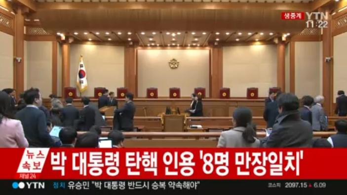南韓憲法法院就總統朴槿惠彈劾案,獲8名法官一致通過。朴槿惠的總統職務將被罷免,成為南韓史上首位被彈劾的總統,60日內將舉行大選。