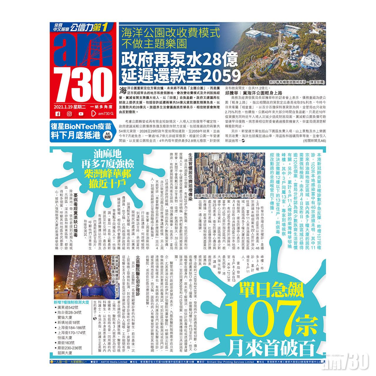 本港新冠肺炎單日確診數字急反彈,昨增107宗確診,102宗本地感染當中有46宗源頭未明,其中11宗來自油麻地指定區域,區內再多7幢大廈的居民需要強制檢測。由本月4日至昨日,該區域已錄得逾120宗個案,當局分析認為與少數族裔生活習慣有關。另外,累計5戶11人確診的柴灣峰華邨曉峰樓,其中3戶同屬13室,專家到場視察後決定撤離12樓以下的13室住戶,料病毒經改動過的坐廁喉管向下傳播。
