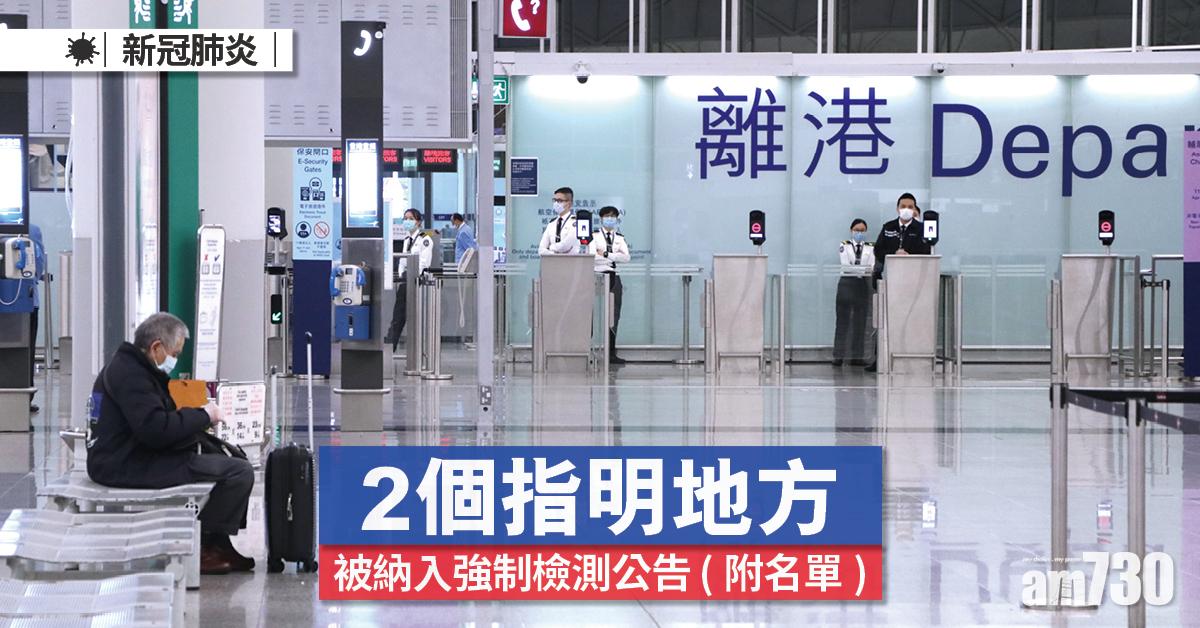 本港今日(12日)多2個地點被納入強制檢測公告。食物及衞生局指,由於香港國際機場近期出現數宗確診個案,為謹慎起見,以機場一號客運大樓、停機坪或中場客運大樓為其通常工作地點的人士,不論是否已完成接種新冠疫苗,均需要接受定期檢測。
