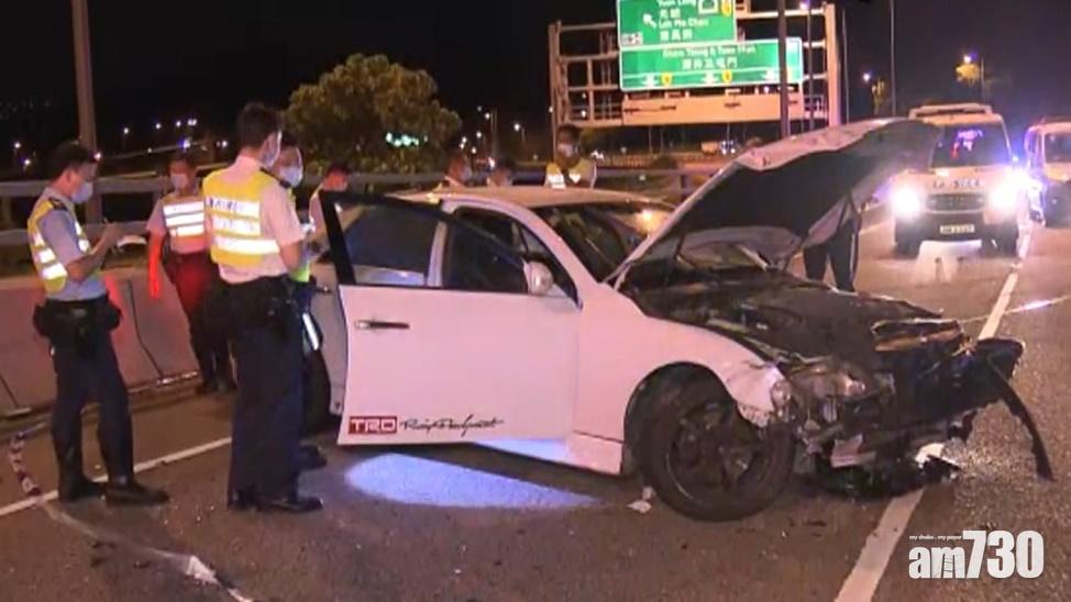 一部私家車凌晨在元朗衝越警方路障後逃至屯門公路失事,司機遺下受傷女乘客逃逸,警方正追緝司機下落。