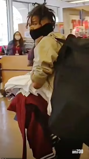 其中一名竊匪雙手拿滿褲子,其他顧客不敢上前阻止。(互聯網)