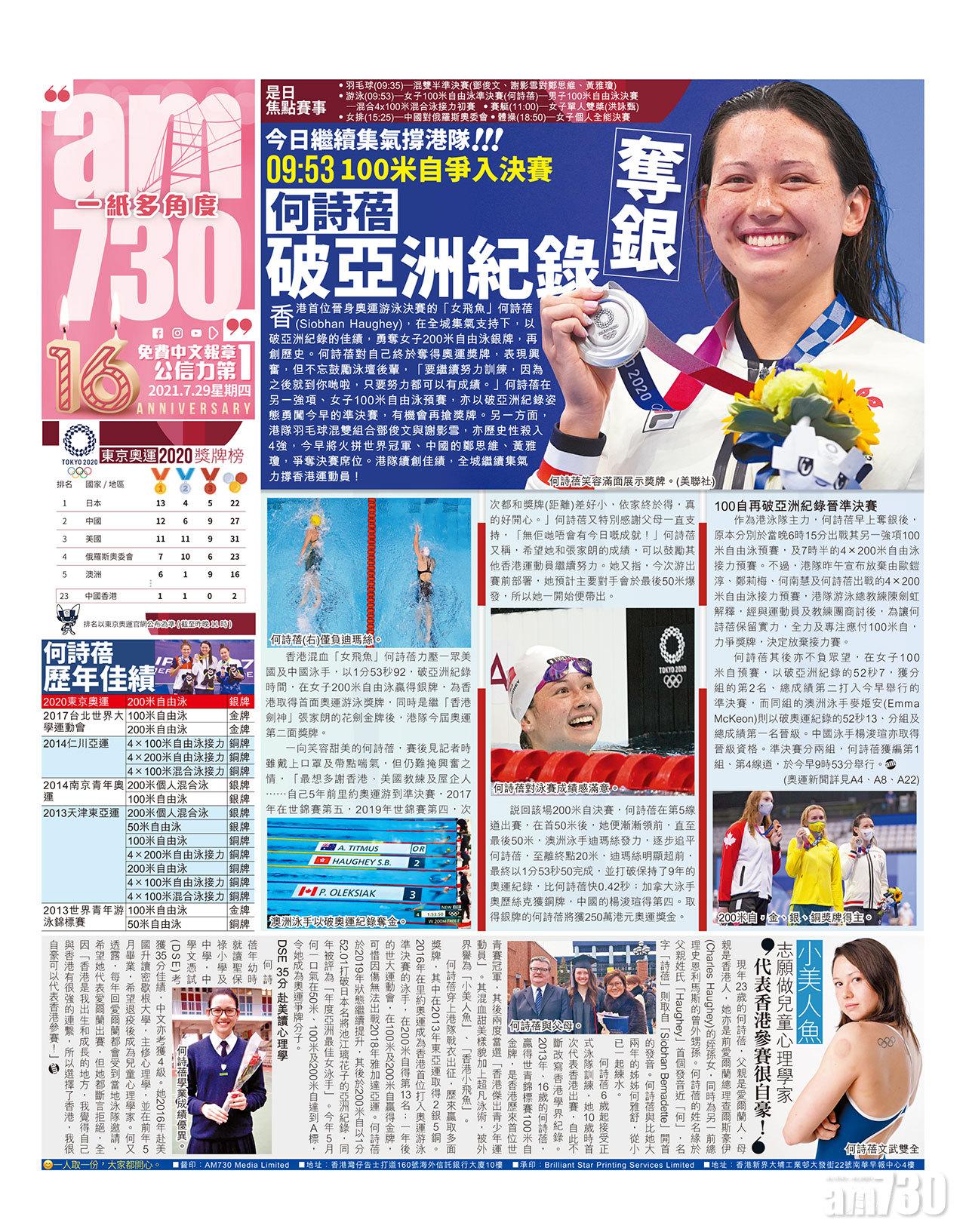 香港首位晉身奧運游泳決賽的「女飛魚」何詩蓓(Siobhan Haughey),在全城集氣支持下,以破亞洲紀錄的佳績,勇奪女子200米自由泳銀牌,再創歷史。何詩蓓對自己終於奪得奧運獎牌,表現興奮,但不忘鼓勵泳壇後輩,「要繼續努力訓練,因為之後就到你哋啦,只要努力都可以有成績。」何詩蓓在另一強項、女子100米自由泳預賽,亦以破亞洲紀錄姿態勇闖今早的準決賽,有機會再搶獎牌。另一方面,港隊羽毛球混雙組合鄧俊文與謝影雪,亦歷史性殺入4強,今早將火拼世界冠軍、中國的鄭思維、黃雅瓊,爭奪決賽席位。港隊續創佳績,全城繼續集氣力撐香港運動員!
