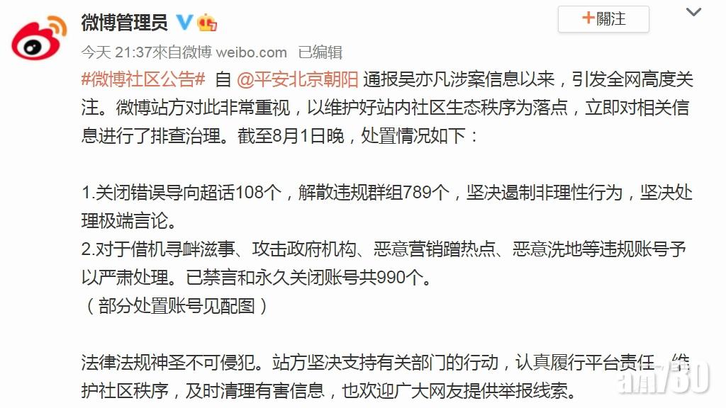 微博管理員公布已處理一批涉及吳亦凡案的違規帳號。