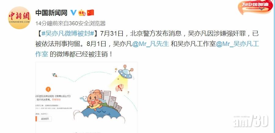 與此同時,吳亦凡微博帳號「Mr_凡先生」及其工作室帳號「Mr_吳亦凡工作室」昨晚深夜被封。