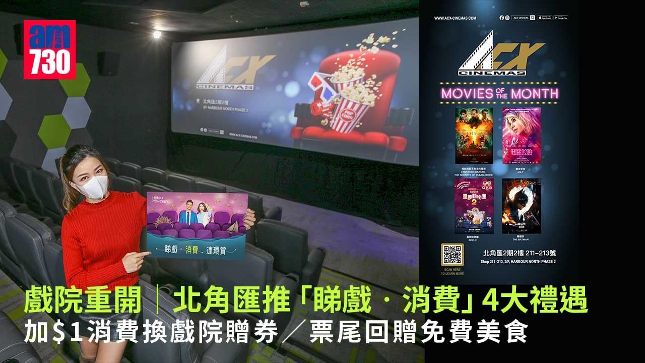 戲院重開日(即4月21日)起至12月31日,顧客只需出示北角匯參與商戶滿HK$100或以上的即日單一機印發票,於ACX戲院購買正價戲票時可即享9折優惠。