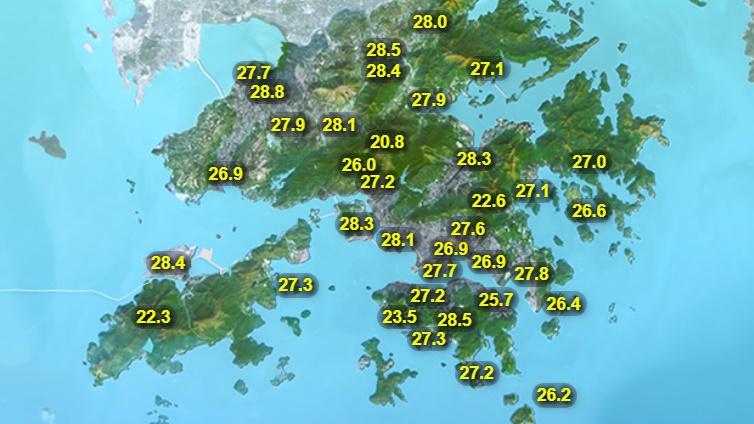 天文台表示,高空反氣旋正為廣東沿岸帶來普遍晴朗的天氣。本港地區今日天氣預測大致天晴及炎熱。日間市區最高氣溫約32度,新界再高一兩度。吹和緩東至東南風。展望未來一兩日大致天晴及炎熱。星期日及星期一驟雨增多,風勢頗大,氣溫稍低。