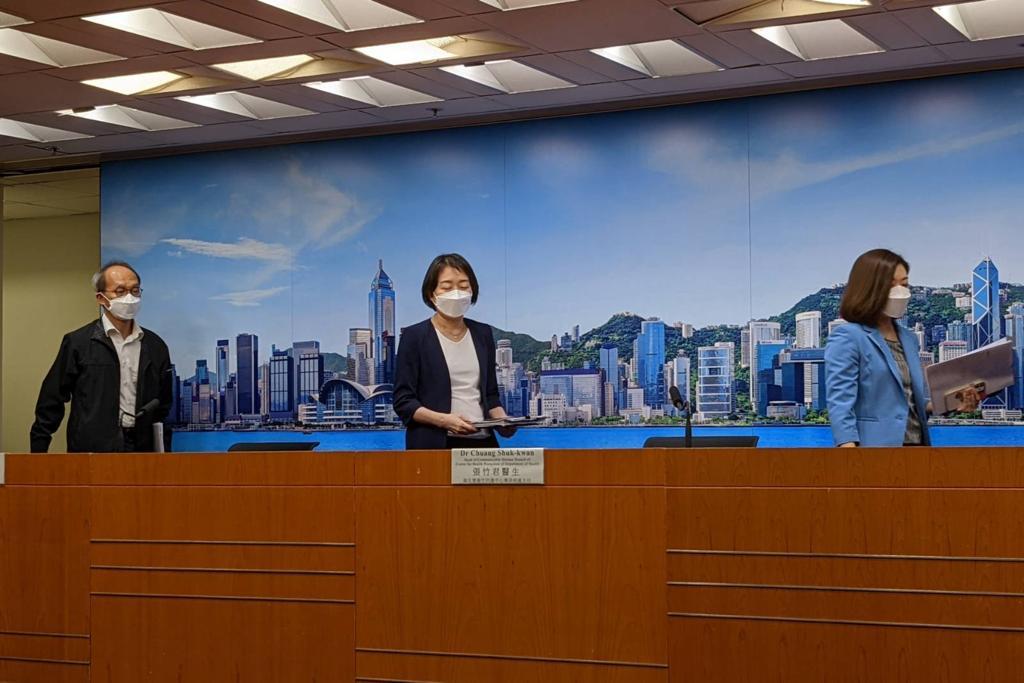衞生防護中心傳染病處主任張竹君(中)、抗疫專家顧問團成員劉宇隆(左)和醫管局總行政經理關慧敏(右)出席新型肺炎疫情記者會。(羅庸軒攝)