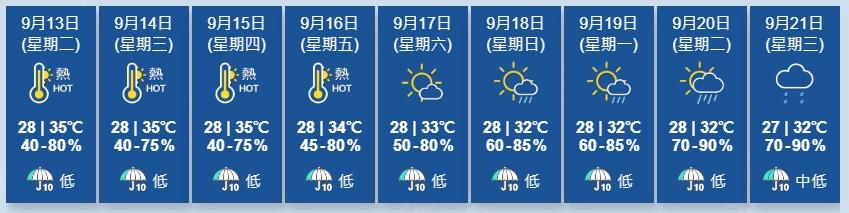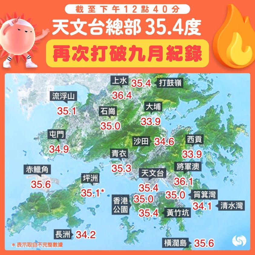 【13:38更新】天文台表示,截至下午12時40分,天文台總部錄得35.4度高溫,再度打破九月最高氣溫紀錄,又指受乾燥大陸氣流影響,預料本周至下周初持續天晴酷熱,呼籲市民注意防暑及防曬。