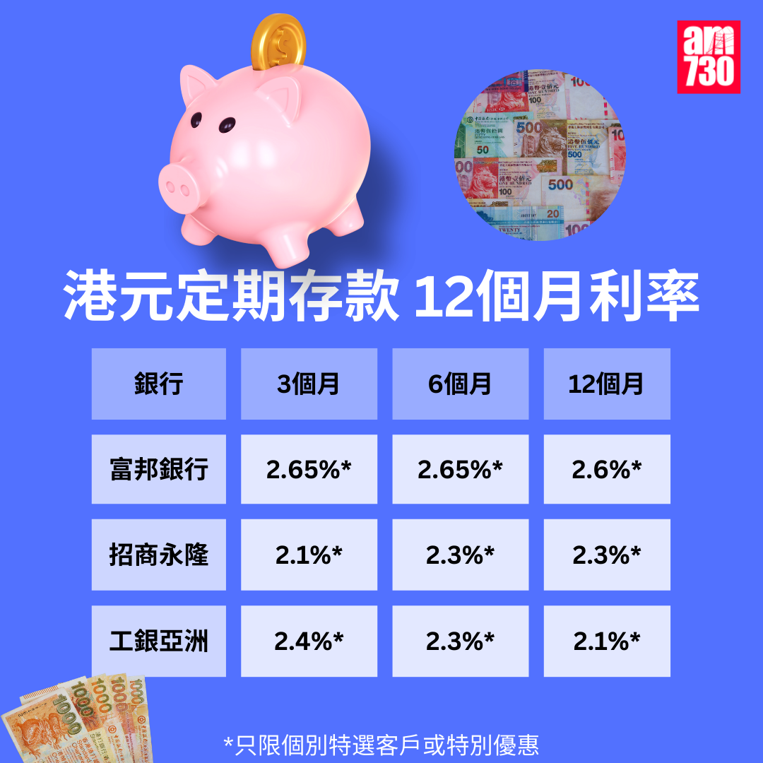 富邦銀行宣布,Fubon+手機應用程式以港元(不論新舊資金)開立指定定期存款,均可享特優年利率。開戶存入港元500,000或以上,三個月2.65%、六個月2.65%、十二個月2.6%。