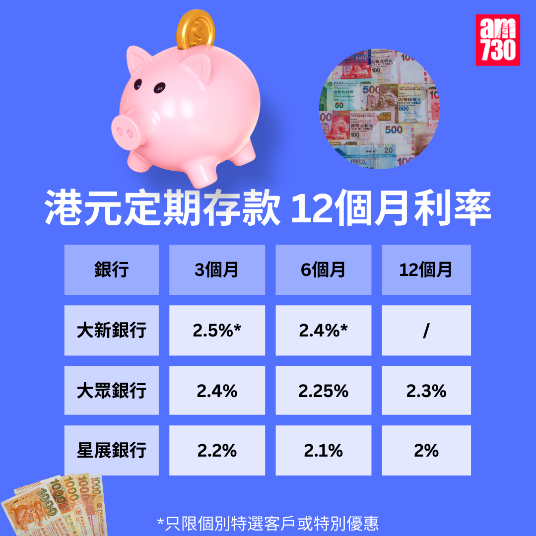 大眾銀行定期存款利率|3個月港元定存息為2.4厘