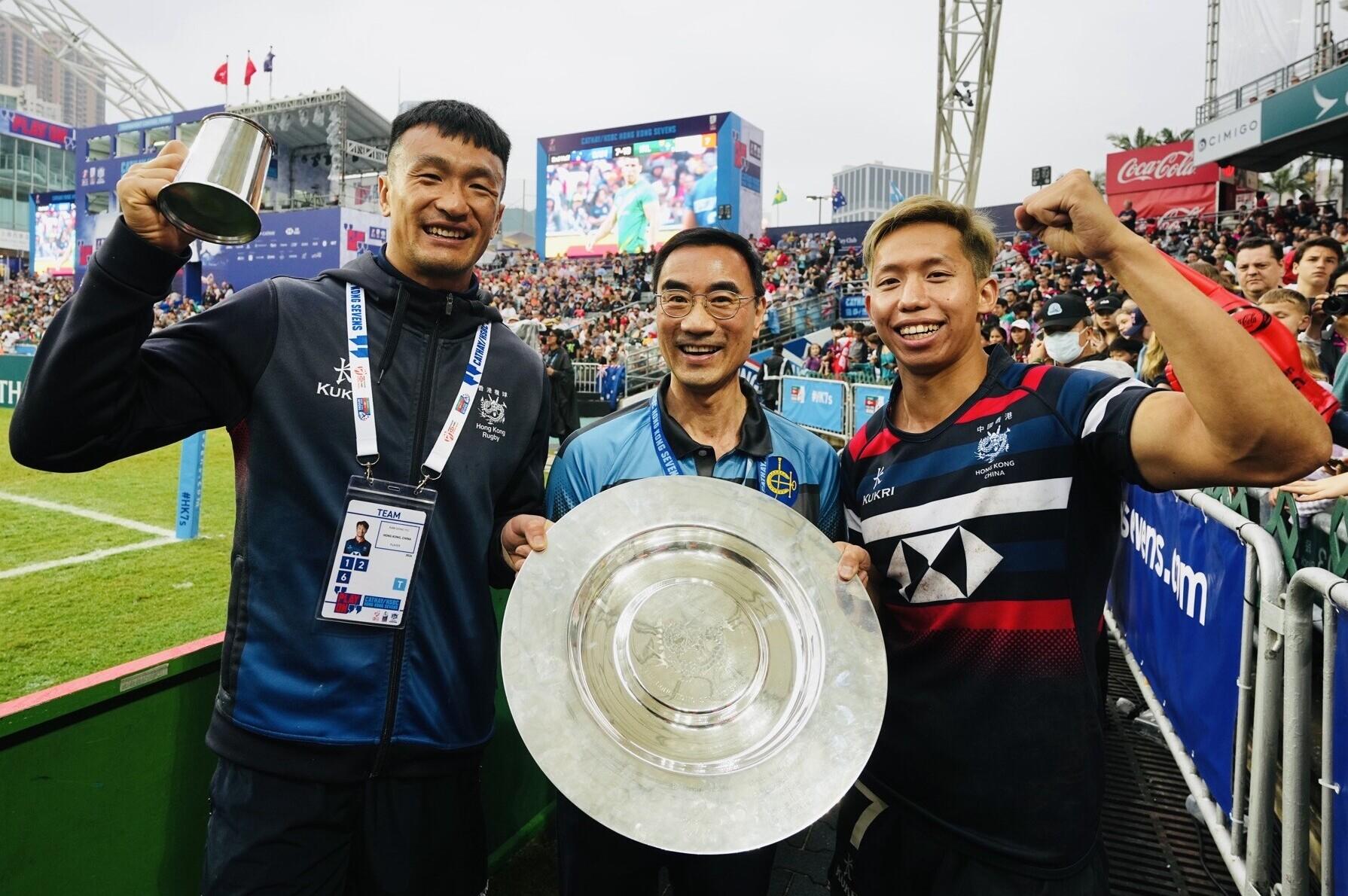 馬會主席利子厚(中) 頒發男子銀盾級別的獎座給得奬隊伍 — 中國香港。