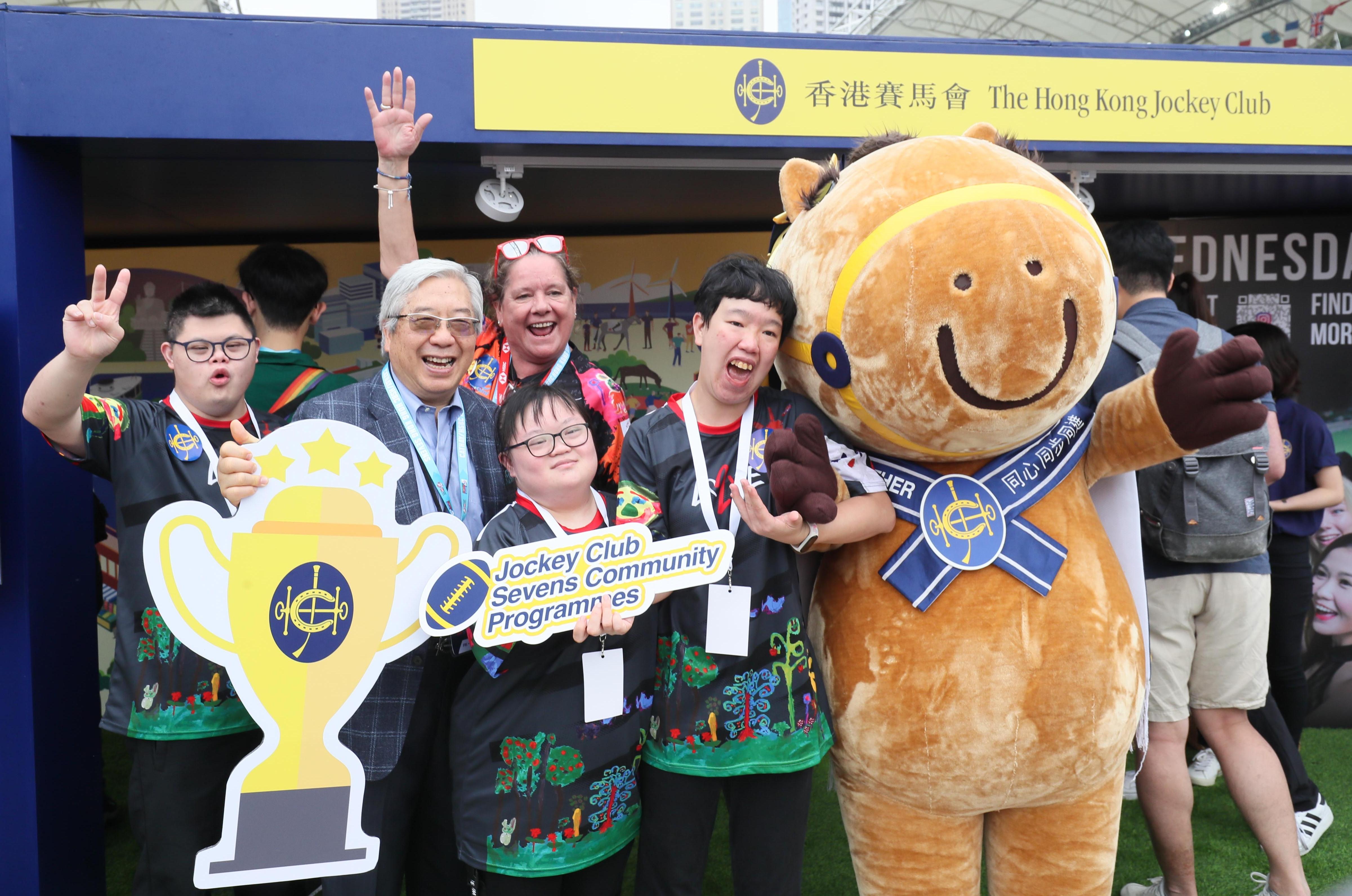 馬會副主席李家祥博士(左二)與「賽馬會社區七人欖球賽體驗日」的受惠者在馬會展區合照。
