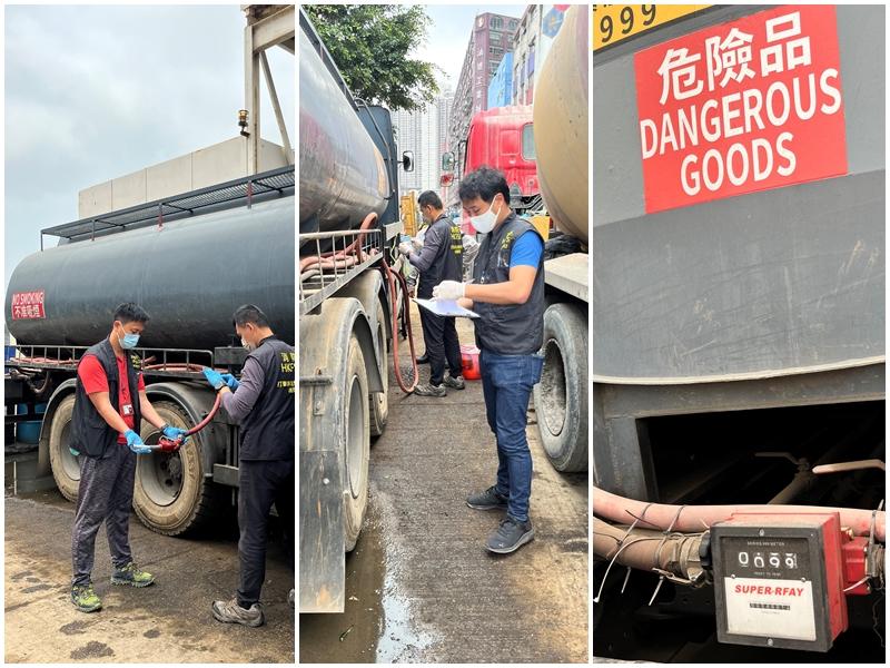 消防處打擊非法燃油轉注特遣隊,今日(13日)中午在觀塘區一帶進行針對性打擊非法加油活動的執法行動,在油塘高輝道搗破一個非法加油站,檢獲約6,400公升柴油,市值約13萬元。行動中,消防處人員發現一部油缸車及大批入油工具,並截獲一名男子,涉嫌違反《危險品條例》及《消防(消除火警危險)規例》,將會被檢控。
