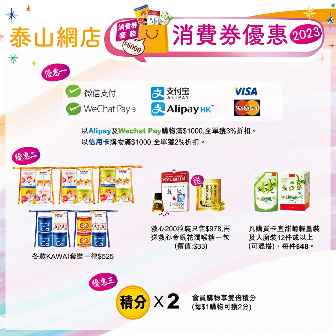 泰山網店由即日起至4月23日進行限時消費券優惠,老少皆宜的KAWAI肝油丸各款套裝一律$525;益氣強心的日本人字牌救心200粒裝只售$978,再送救心金銀花潤喉糖乙包;凡購買天然健康的Karori卡宜甜菊糖輕量裝及入廚裝12件或以上,每件只需$48。若以Alipay及Wechat Pay消費滿$1,000,全單更即享3%折扣;以信用卡購物滿$1,000則享全單2%優惠。會員購物再享雙倍積分,即每$1購物送2分。