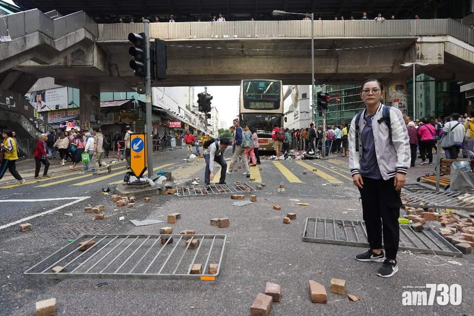 在旺角亞皆老街及彌敦道的十字路口,有大批防暴警戒備及清理在凌晨示威活動遺下的雜物及磚頭。