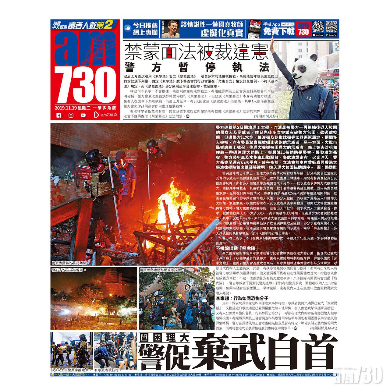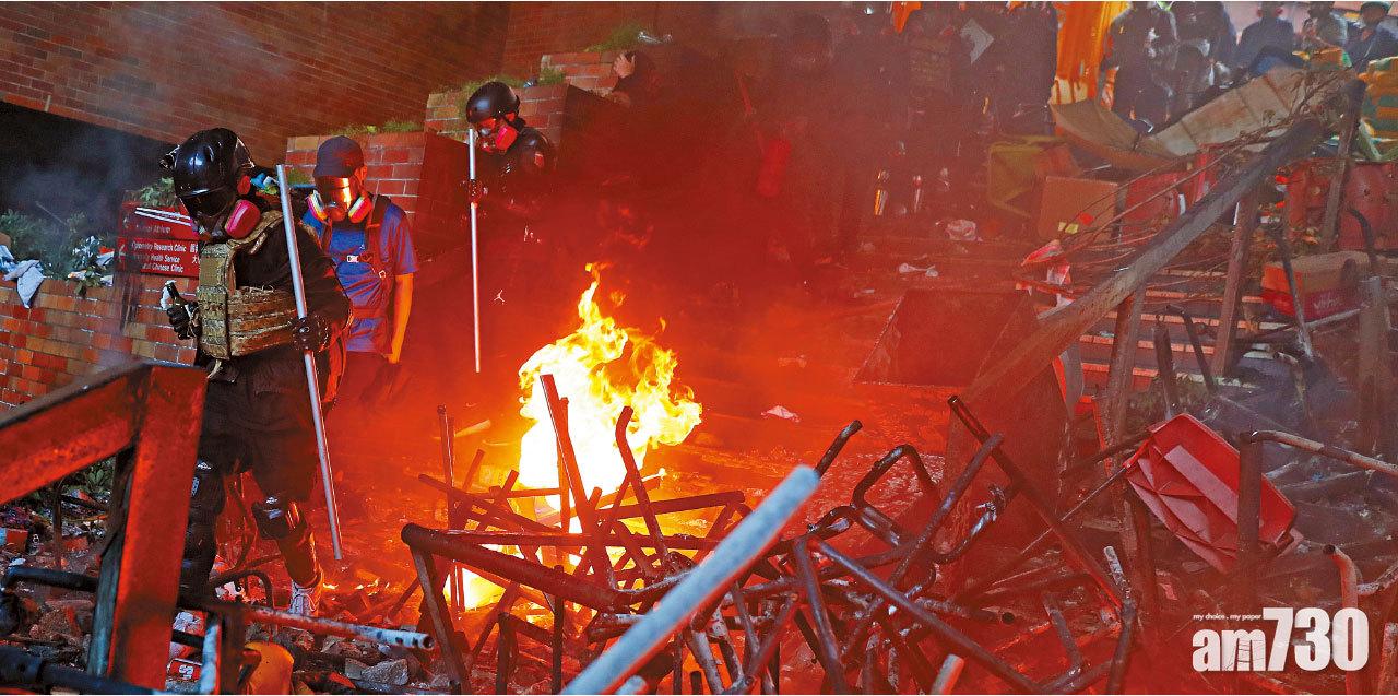 另外,保安局長李家超昨回應理大事件時指,示威者使用汽油彈已變成「家常便飯」,又批評近日示威活動已變得極度危險。他舉例,有人集體攻擊救護車及搶犯,又有人公然駕車撞向警員,行為如同恐怖分子,呼籲在理大內的示威者聽從警方指示離開校園。有組織罪案及三合會調查科高級警司李桂華昨回答有關香港現時恐襲風險評估時稱,警方在評估風險上會考慮組織性及是否有特定、準確有關恐襲的情報兩大因素,而現時香港的恐襲評估程度仍維持在中度水平。(相關新聞見A4-A5)