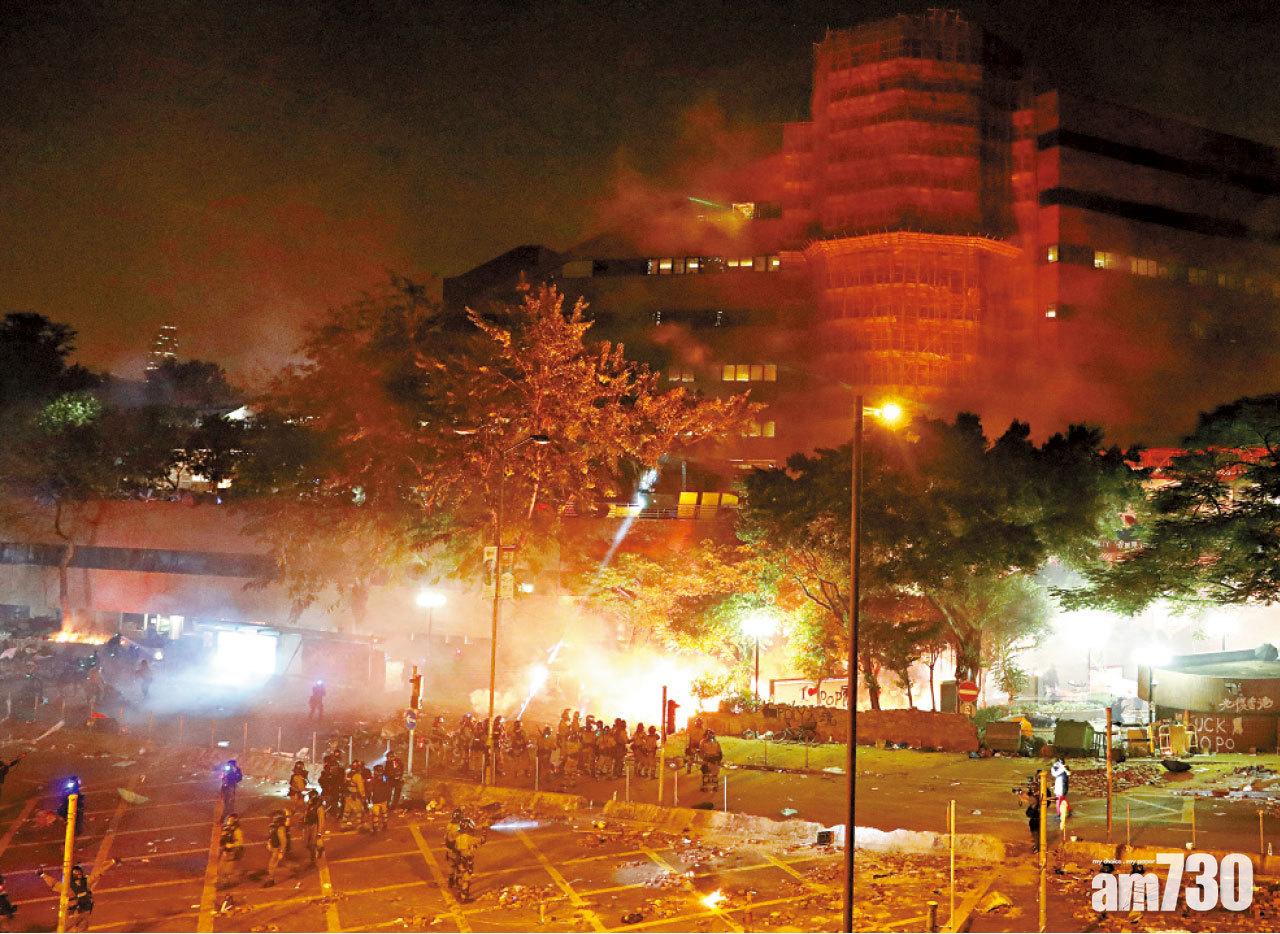 警方連續第2日圍堵理工大學,昨清晨被警方一再追捕後退入校園的黑衣人及示威者,昨日先後多次嘗試突破警方包圍,欲逃離校園,但遭警方以水炮、催淚彈及胡椒球彈等武器逼返原地,期間多人被捕,亦有警員擎實彈槍喝止逃跑的示威者。另一方面,大批市民響應網上號召,往理大聲援被困理大的示威者,晚上在尖沙咀和佐敦一帶通往理大的路上,與嚴陣以待的防暴警察,爆發激烈衝突,警方裝甲車及水炮車出動驅散,多處濃煙密布,火光沖天,雙方衝突至深夜仍未平息。於午夜前,立法會前主席曾鈺成與香港大學法律學院首席講師張達明、多名教育界人士及中學校長,進入理大校園協助調停。圖:路透社