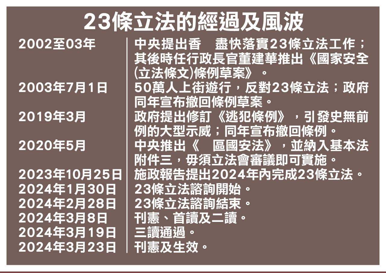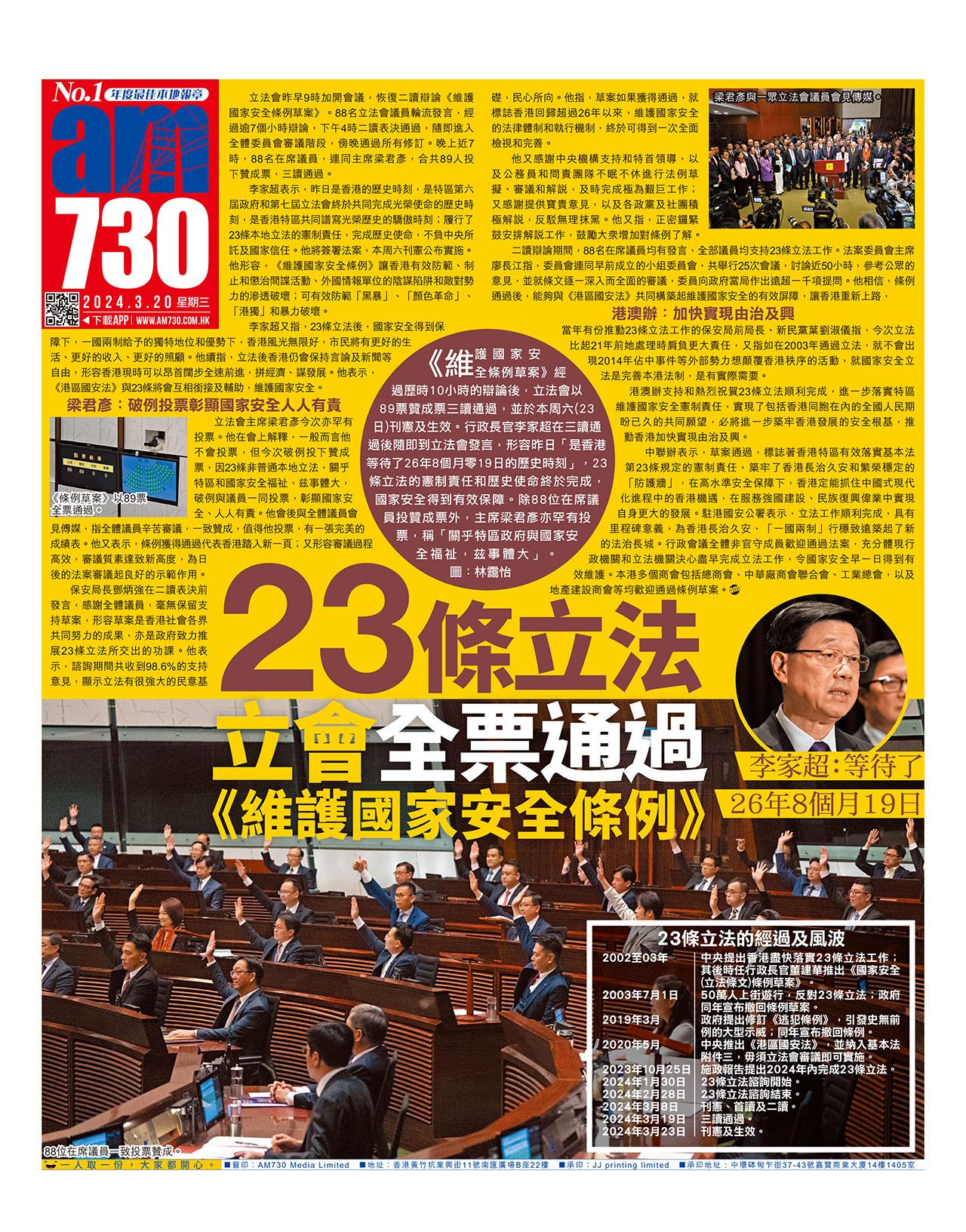 《維護國家安全條例草案》經過歷時10小時的辯論後,立法會以89票贊成票三讀通過,並於本周六(23日)刊憲及生效。行政長官李家超在三讀通過後隨即到立法會發言,形容昨日「是香港等待了26年8個月零19日的歷史時刻」,23條立法的憲制責任和歷史使命終於完成,國家安全得到有效保障。除88位在席議員投贊成票外,主席梁君彥亦罕有投票,稱「關乎特區政府與國家安全福祉,兹事體大」。