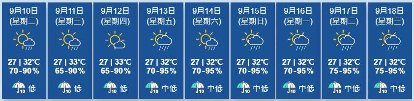 天文台展望未來一兩日天氣酷熱,局部地區有驟雨。本周後期短暫時間有陽光,亦有幾陣驟雨。天文台指,一股微弱東北季候風會在未來一兩日為華南帶來大致良好的天氣,高溫亦會觸發驟雨。而一道廣闊低壓槽會在本周後期至下週初為南海中北部帶來不穩定天氣。預料一股東北季候風會在下周初影響華南。此外,一個廣闊低壓區會在未來一兩日影響東海一帶。