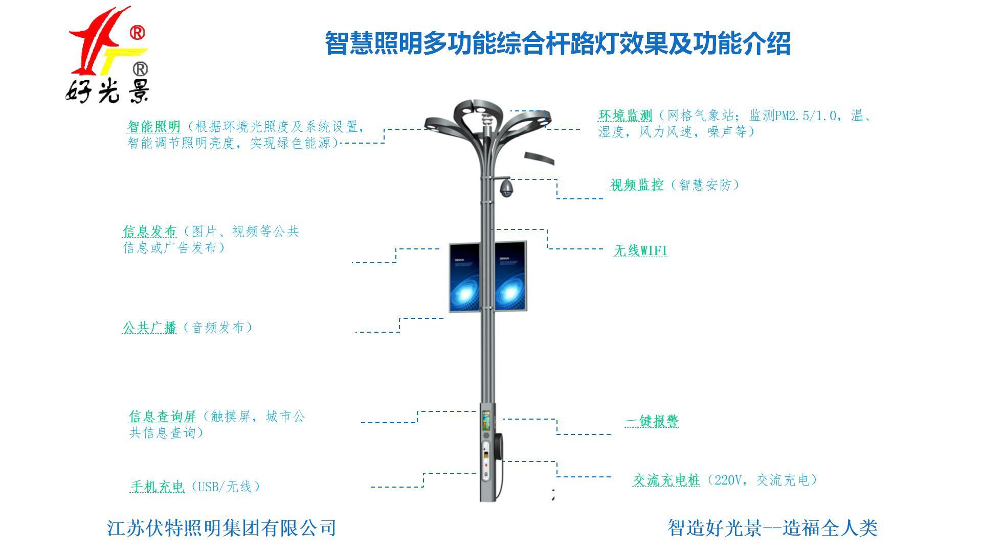 江蘇伏特照明集團有限公司的智慧照明多功能綜合杆路燈集智慧照明、環境監測、視頻監控、交通管理、無線通訊、資訊發佈、一鍵報警、便民充電等智慧部件資訊採集、控制、智慧計算於一體的智慧化產品。具備空間上可擴展,智慧邊緣計算,智慧設備聯動的特點是構建新型智慧城市的重要載體。依託強大的物聯網和綜合管理平臺,實現了智慧照明、綠色能源、智慧安防、智慧交通、無線城市、互通互聯、智慧感知、智慧市政等諸多應用。