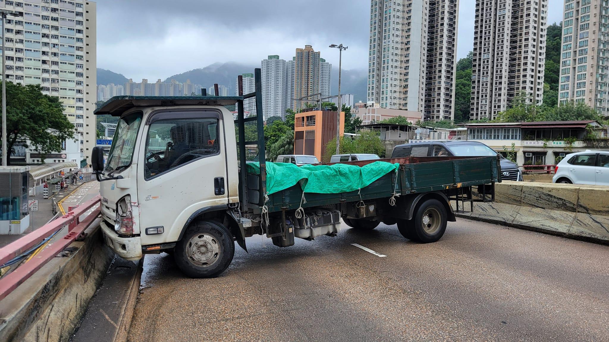 今日(15日)中午12時許,一輛貨車沿龍翔道天橋往荃灣方向行駛,駛至彩虹邨對開時,突然失控撞壆,橫亘路中,車頭輕微損毀。