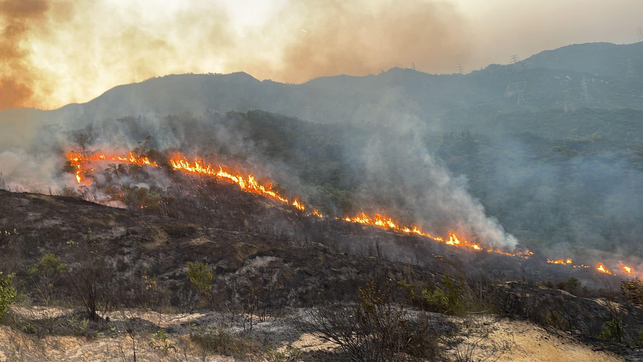 元朗大棠昨日(28日)下午約三時發生山火,大棠有機生態園及荔枝山莊對開山頭,出現兩條分別長50米、及長約200米的「火龍」;焚燒逾17小時至今日(29日)早上8時仍未救熄,但火龍經消防通宵灌救後,已縮減至兩條各約50米的火線。根據現場圖片可見,濃煙直衝半空,仍見山腰至山頂位置有火舌。
