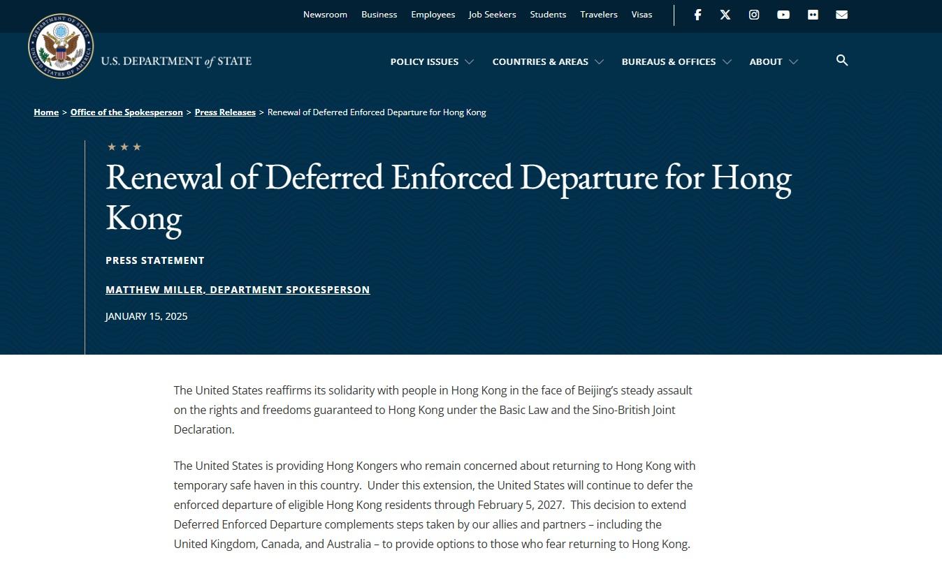 即將卸任的美國總統拜登再次延長在美國的港人的「延遲強制離境」(Deferred Enforced Departure,簡稱DED)計劃兩年至2027年2月,北京要求美國停止插手香港事務,香港特區政府亦發聲明,表示強烈不滿和譴責美國簽署有關備忘錄。