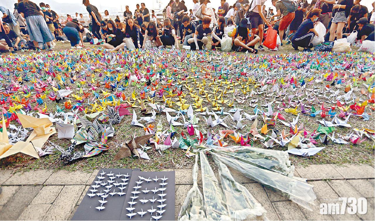 有網民昨午發起在觀塘海濱花園舉行「自由紙鶴追悼會」,數百人在海濱花園聚集及摺紙鶴,不少市民帶同子女出席活動;發起人指紙鶴寓意自由和希望,活動讓大家透過紙鶴發表意見。(鍾式明攝)