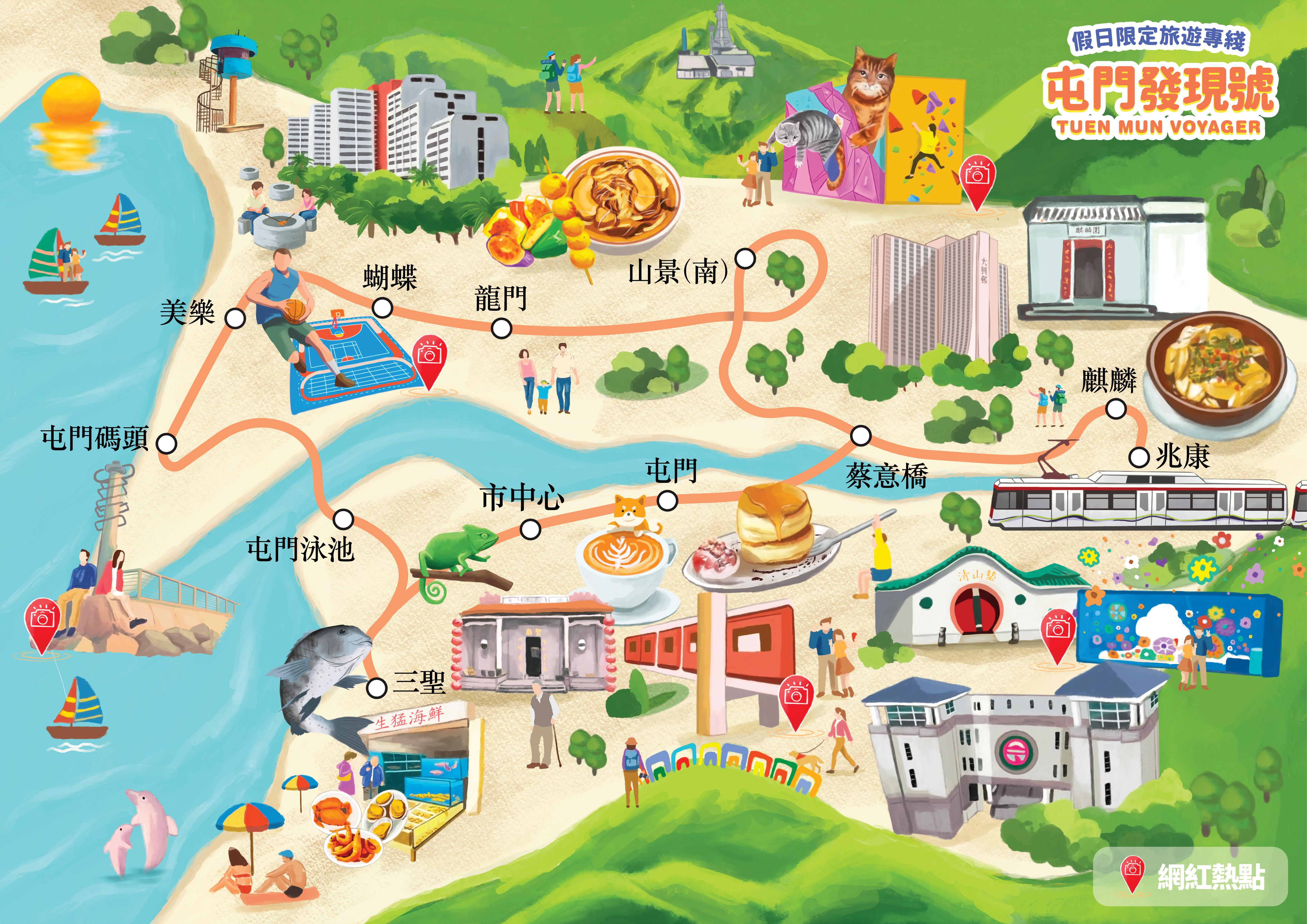 全新輕鐵旅遊專綫「屯門發現號」,以色彩繽紛的手繪插畫,在車廂內外描繪屯門獨一無二的文化景觀。旅遊專車將在周末及公眾假期以循環綫模式行駛,全日共6班列車,車程約1小時15分鐘,穿梭及停靠12個特選輕鐵站,包括兆康站、麒麟站、山景(南)站、龍門站、蝴蝶站、美樂站、屯門碼頭站、屯門泳池站、三聖站、市中心站、屯門站及蔡意橋站。多個特選輕鐵站分別組成「網紅打卡之旅」、「覓食嚐鮮之旅」、「親子同樂之旅」三大主題行程,旅客可按照喜好自行安排探訪各車站及路線。