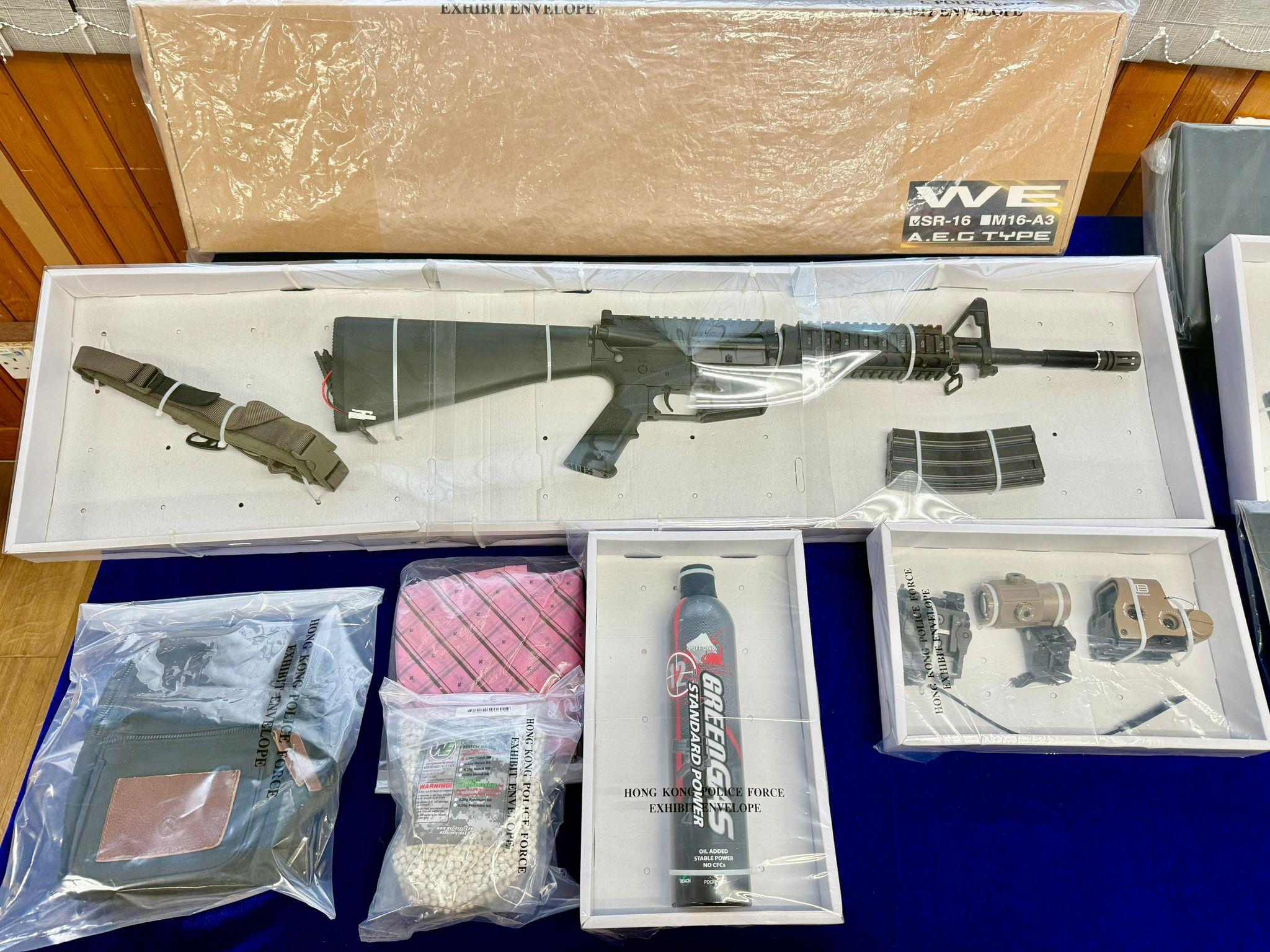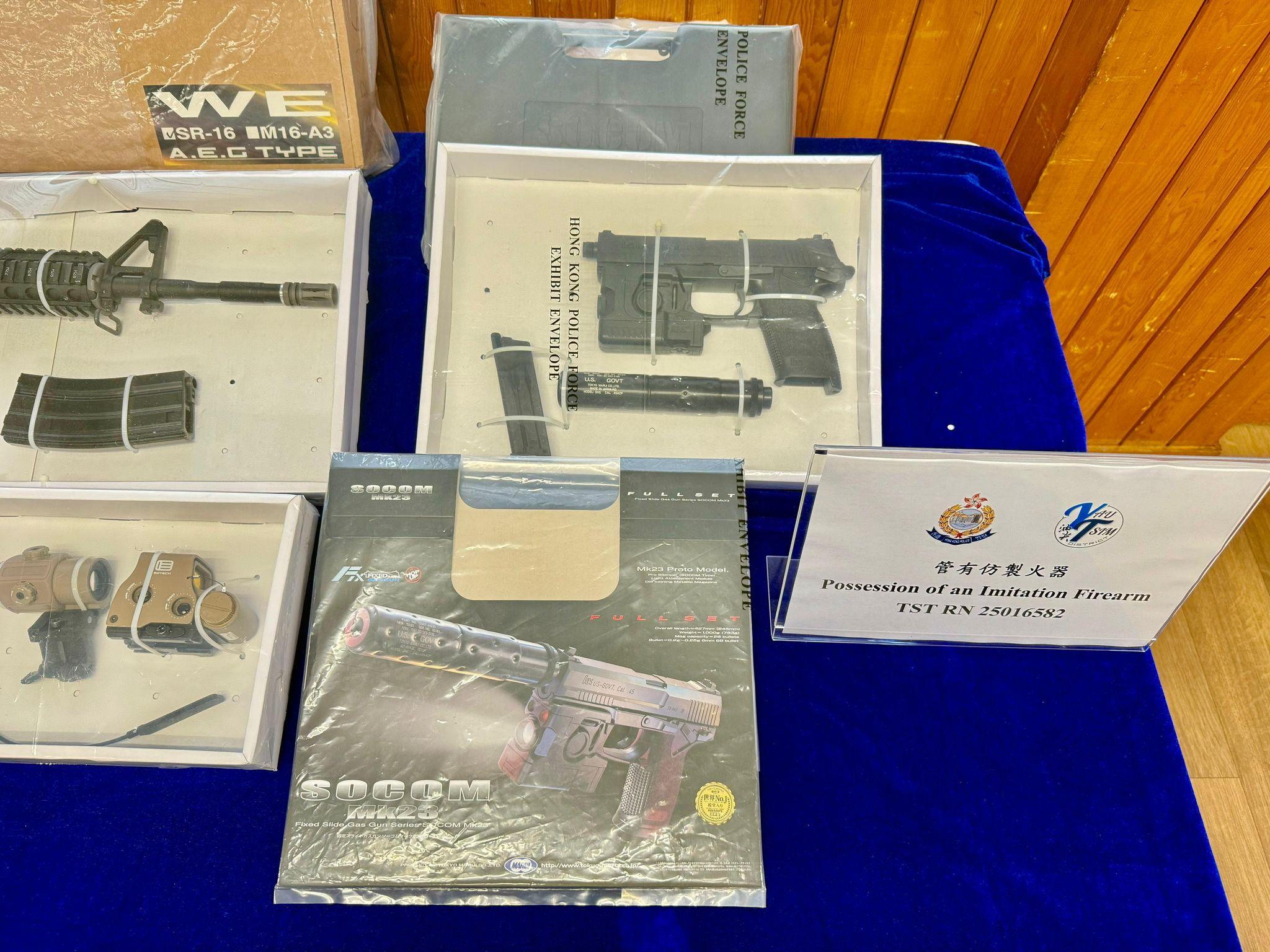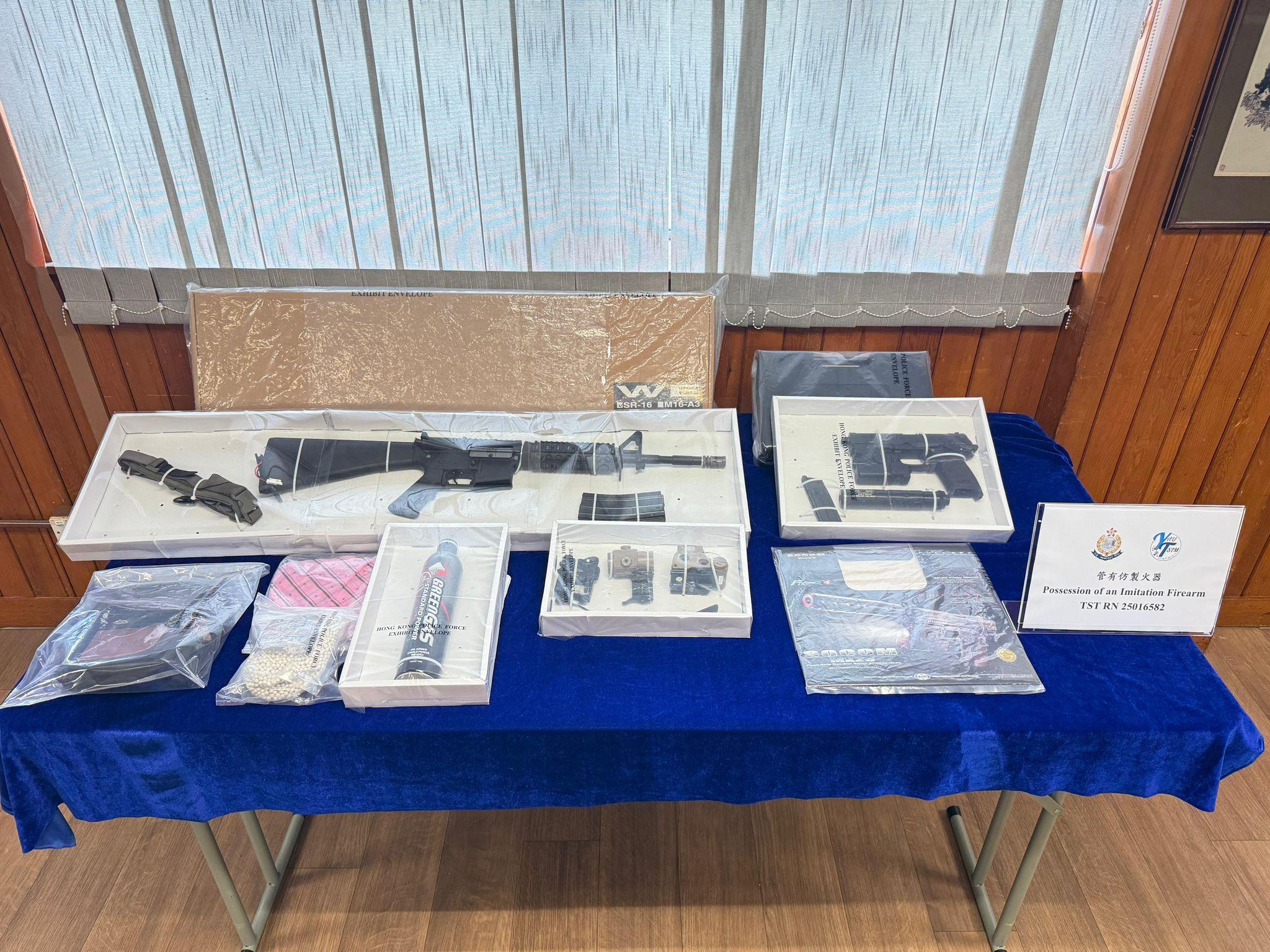 一名36歲內地遊客手持疑似步槍及手槍現身乘坐港鐵,警方追查下即日在佐敦拘捕該名男子,他涉嫌管有仿製槍械,行動中檢獲兩支仿製槍、彈匣及彈珠。