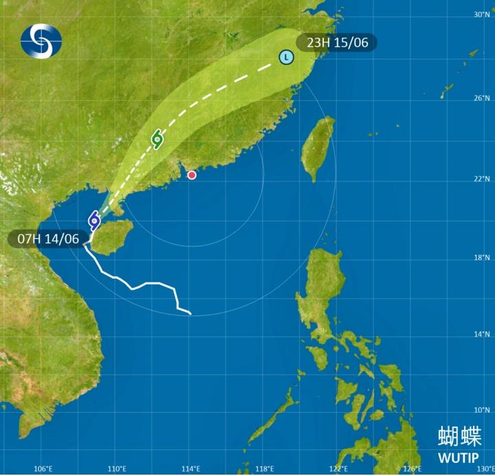 三號強風信號現正生效。天文台發出雷暴警告,有效時間延長至下午4時。天文台表示,與蝴蝶相關的強風區會在今日餘下時間至明早影響珠江口一帶,本港有狂風驟雨,離岸及高地風力間中達烈風程度。蝴蝶會在明早於本港西北約300公里左右掠過,三號強風信號會至少維持至明日中午。除非蝴蝶在內陸維持較高強度並採取較為接近珠江口的路徑,否則改發八號信號的機會甚低。雖然星期一及星期二蝴蝶已遠離及消散,但活躍西南氣流會為廣東沿岸帶來大驟雨,市民請保持警惕。