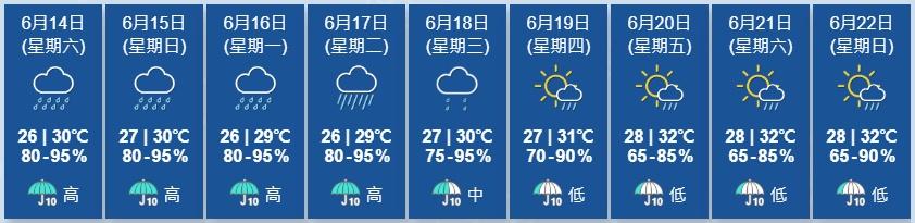 本港地區今日天氣預測大致多雲,間中有幾陣狂風驟雨及幾陣雷暴。日間最高氣溫約30度。吹清勁偏南風,風勢逐漸增強,稍後高地達烈風程度。海有大浪及湧浪。天文台展望,明日仍有狂風驟雨,初時風勢及雨勢頗大,海有大浪及湧浪,稍後風勢逐漸緩和。隨後一兩日天氣仍然不穩定。天文台又指,熱帶氣旋蝴蝶會在今日於雷州半島附近再次登陸,隨後橫過廣東及廣西交界一帶,與其相關的雨帶會在今明兩日影響華南沿岸,該區會有狂風大驟雨及雷暴,風勢頗大,海有湧浪。蝴蝶會在下周初逐漸遠離沿岸地區及減弱,但受偏南氣流及高空擾動影響,廣東間中仍有大驟雨及雷暴。預料高空反氣旋會在下週中後期逐漸增強,廣東地區天色好轉,天氣炎熱。