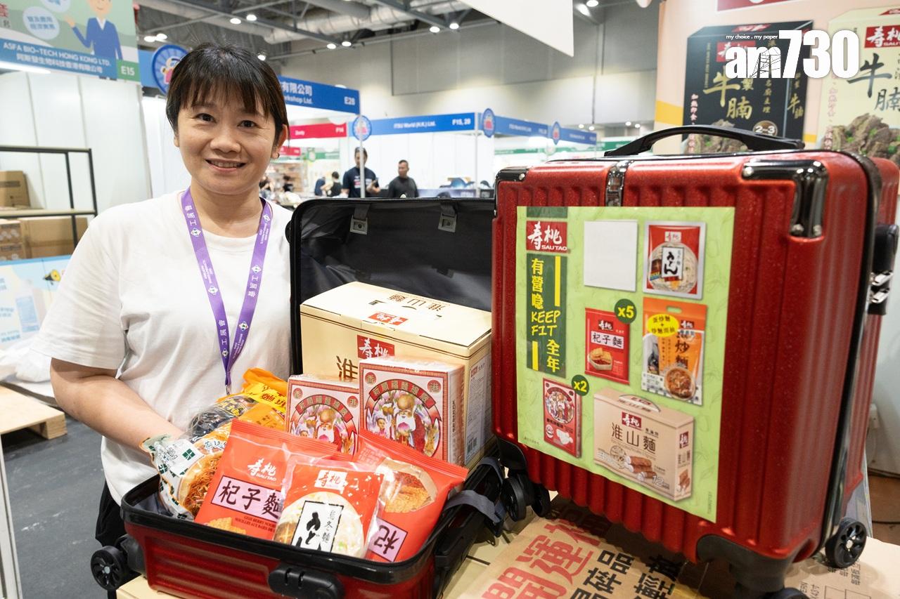 至於於本地展商方面,「壽桃集團」主打旅行喼麵食禮盒,市民只要120元即可買到一個裝有杞子麵、蛋炒麵等產品的旅行喼。負責人劉小姐表示,禮盒原價320元,但盼展會價120元能吸引顧客選購。她又指,今次為首次參展,由於現時港人北上較多,所以入貨量方面較謹慎,但對整體生意有信心。
