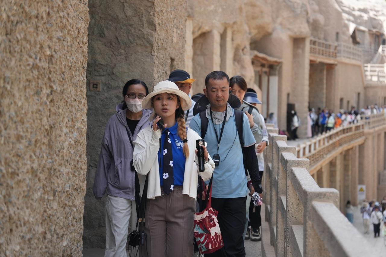 實習生黃靖淇實踐所學成為敦煌莫高窟的實習講解員,為遊客導覽和解說洞窟,宣揚敦煌文化。