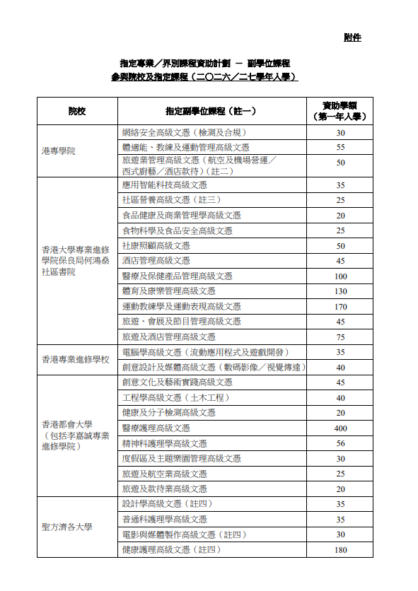 教育局公布,指定專業/界別課程資助計劃,在2026/27學年將資助6所專上院校、共32個副學位課程的2,131個學額。