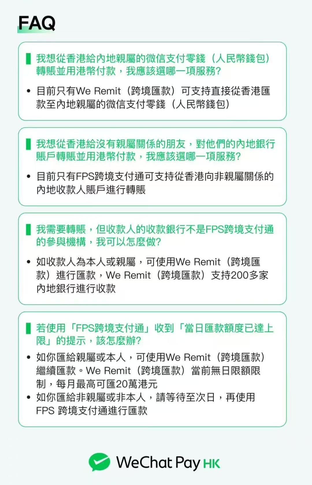 透過WeChat Pay HKFPS使用「跨境支付通」為免手續費,當中北向匯款(香港至內地)每人每日1萬港幣,每年上限20萬港幣,前述額度均按每一付款機構計算,不同機構間額度互不影響。