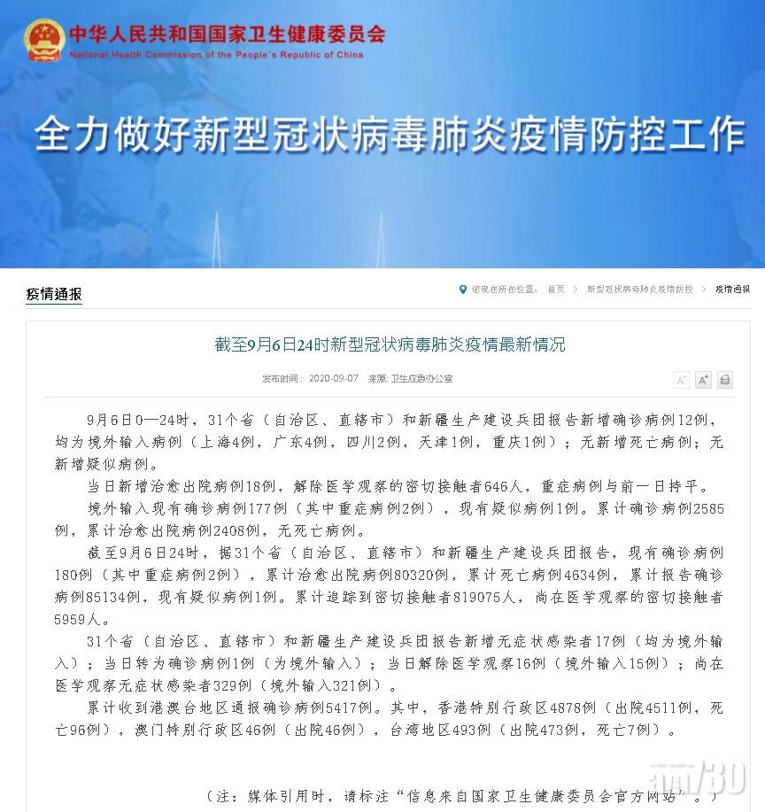 返回 本地 出版:2020-Sep-07 02:45 更新:2020-Sep-07 02:45 【新冠肺炎】內地昨增12宗境外輸入病例 分享: (國家衛健委網頁截圖) 國家衛健委公布,內地昨日新增12宗確診個案,全部屬於境外輸入病例。其中,上海及廣東分別有4宗、四川有2宗、天津及重慶分別有1宗,而無症狀感染者則新增17宗。 至於內地累計死亡人數維持在4,634人,累計確診人數則有85,134人。 ADVERTISEMENT送QOLLABS美顏益生菌膠原蛋白粉(高效版)