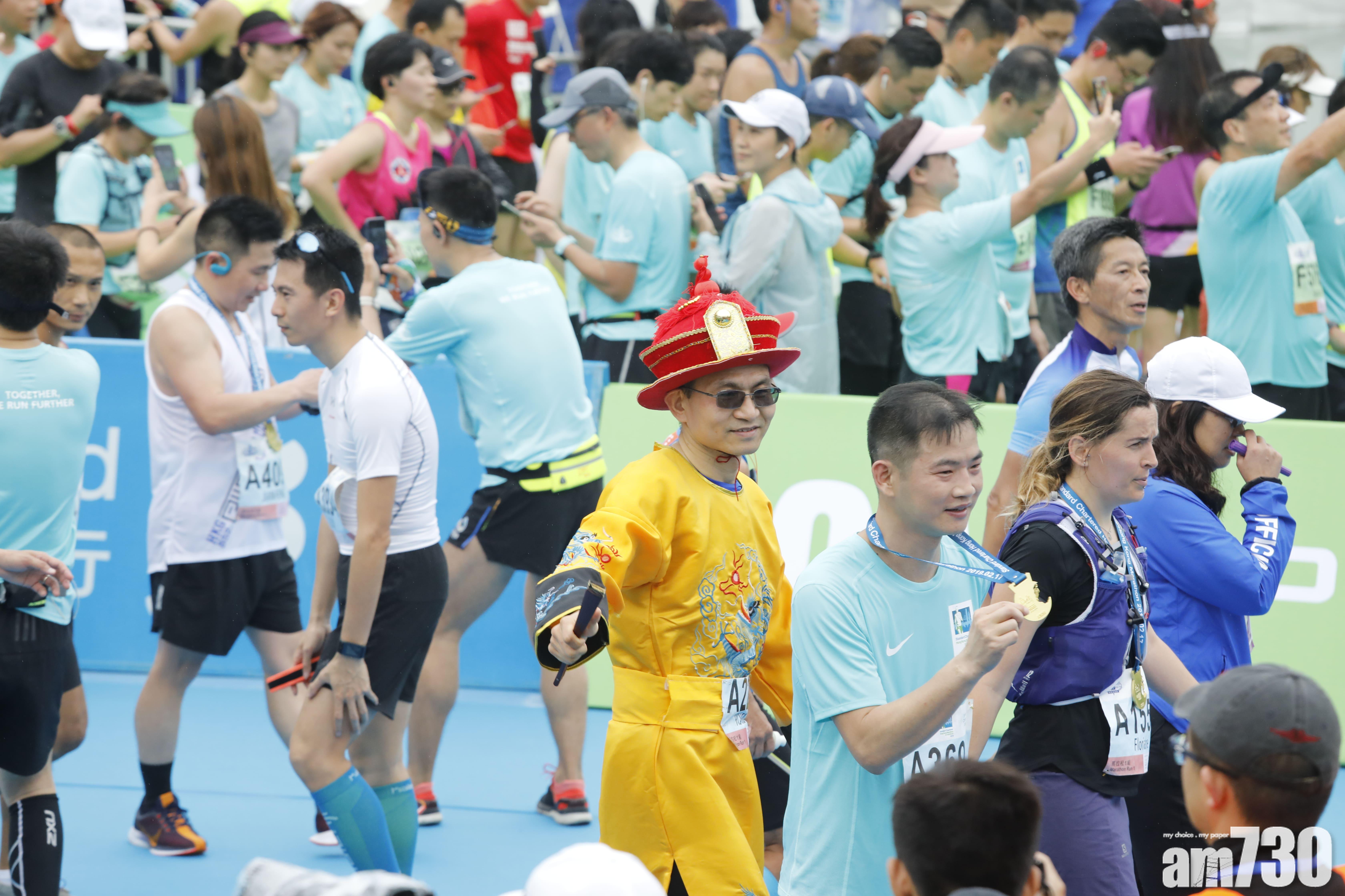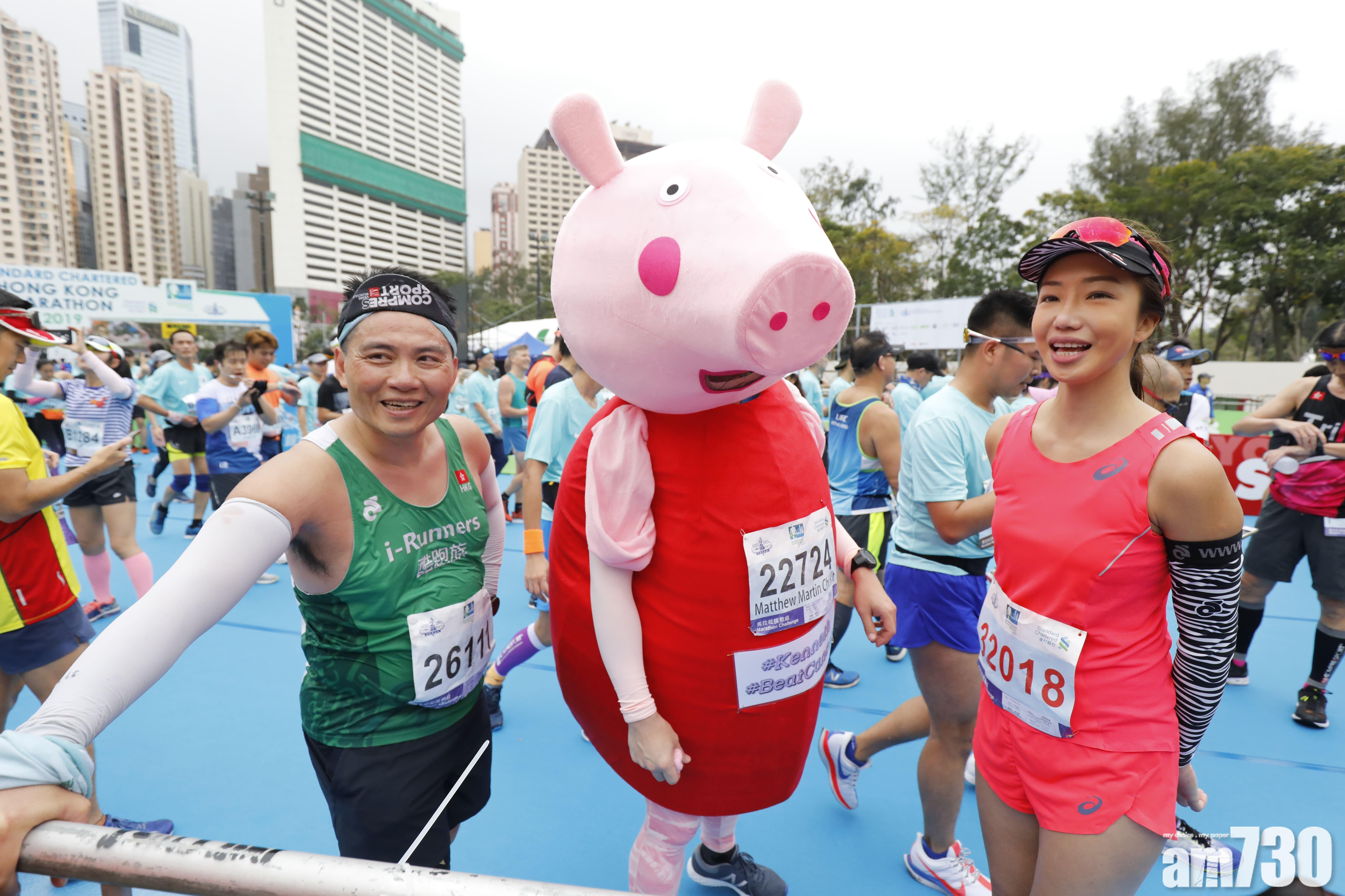 渣打香港馬拉松今早舉行,不少跑手穿上奇裝異服參與這一年一度的盛事。當中莫先生穿上豬年的主角—小豬佩奇(Peppa Pig)的服飾,為其患病的朋友打氣。有多名跑手穿上熊貓、黑臉琵鷺等瀕臨絕種的動物服飾,宣揚環保訊息。另外,亦有跑手以熊本熊、皇帝等造型亮相。