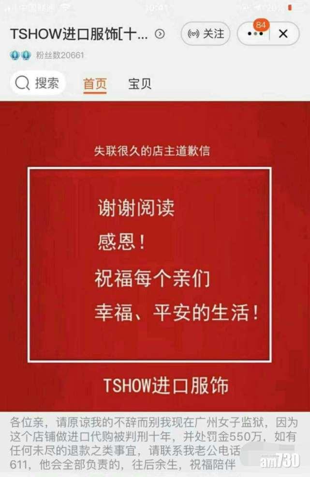 事件本來不受關注,直至游婦開業12年的淘寶網店「TSHOW進口服飾」,上周五突然「上架」一份道歉信,解釋店主失蹤超過一年的原因,才掀起網民熱烈討論。不少網民哀嘆「代購末日」,輿論更提醒,嚴管代購的《電子商務法》將於明年1月起實施。