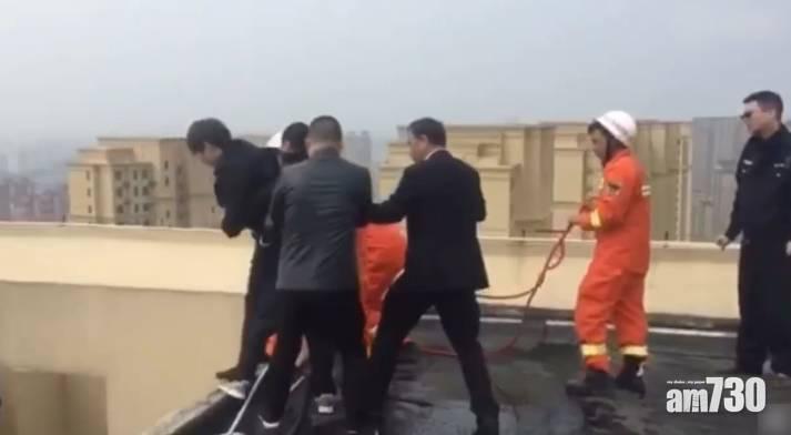消防員、警方及物業管理人員合力拉回欲跳樓的男子。(互聯網)