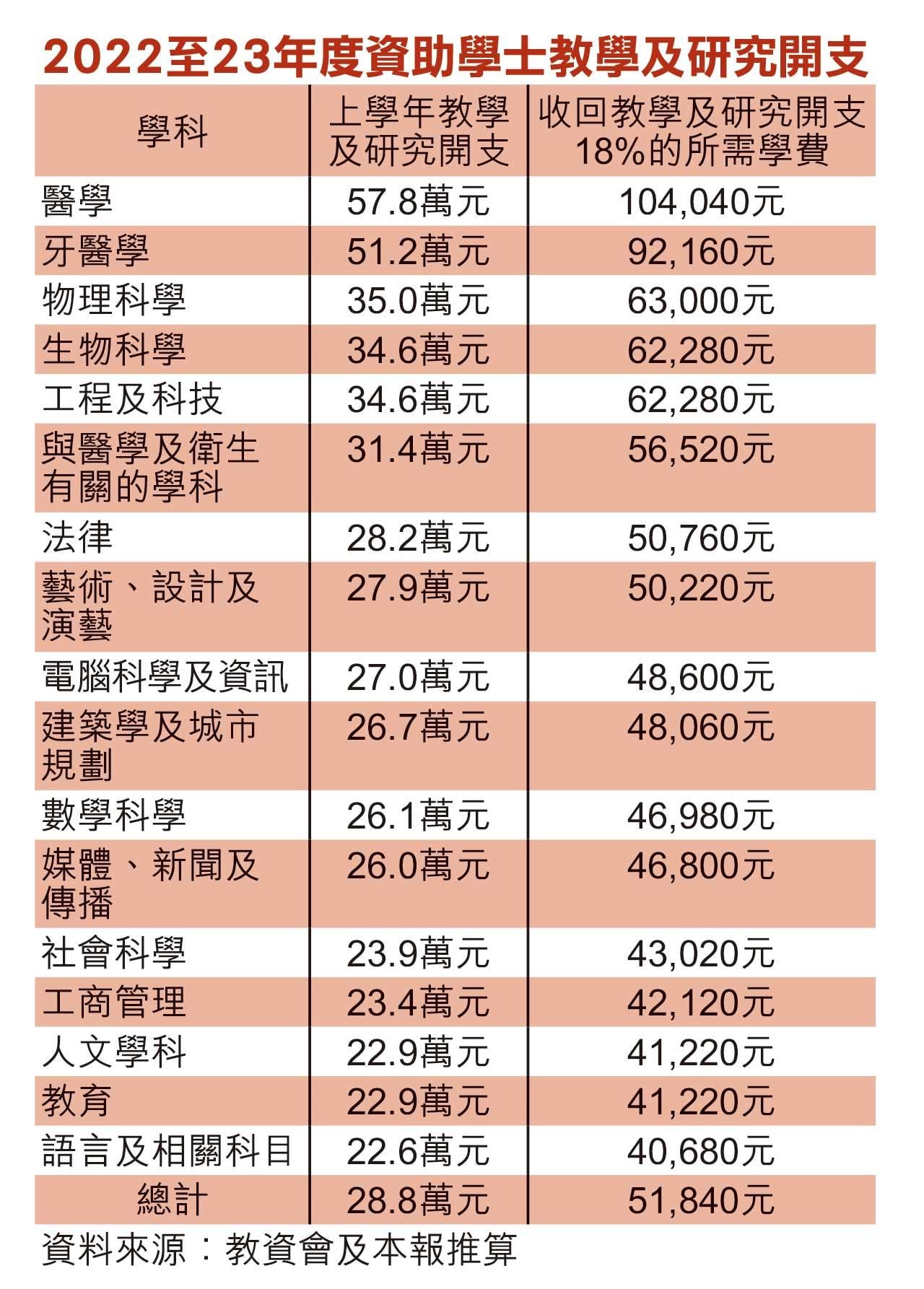 若直接計算回收教學及研究開支的18%,醫學和牙醫學學費分別10.4萬及9.2萬元,物理學費至少6.3萬元,生物、工程及科技學費至少6.2萬元;而語言及相關科目的學費則至少4萬元。
